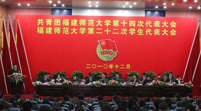 团旗飘扬,团徽闪耀,团歌嘹亮。12月19日上午9时,共青团福建师范大学第十四次代表大会、福建师范大学第二十二次学生代表大会在旗山校区图书馆学术报告厅隆重召开。团省委副书记宿利南,校党委书记罗萤,校长黄汉升,校党委副书记游小波,校党委常委、纪委书记许歌平,副校长李敏,校关工委主任、原校纪委书记陈锋,省学联主席徐君,团省委学校部部长苏畅,在榕各兄弟高校团委书记、学生会主席,学校各部处主要负责同志、各学院党委分管学生工作负责人,第十三届校团委常委,以及200名团代会代表和198名学代会代表参加了大会。省内外50多所高校发来贺信贺电。