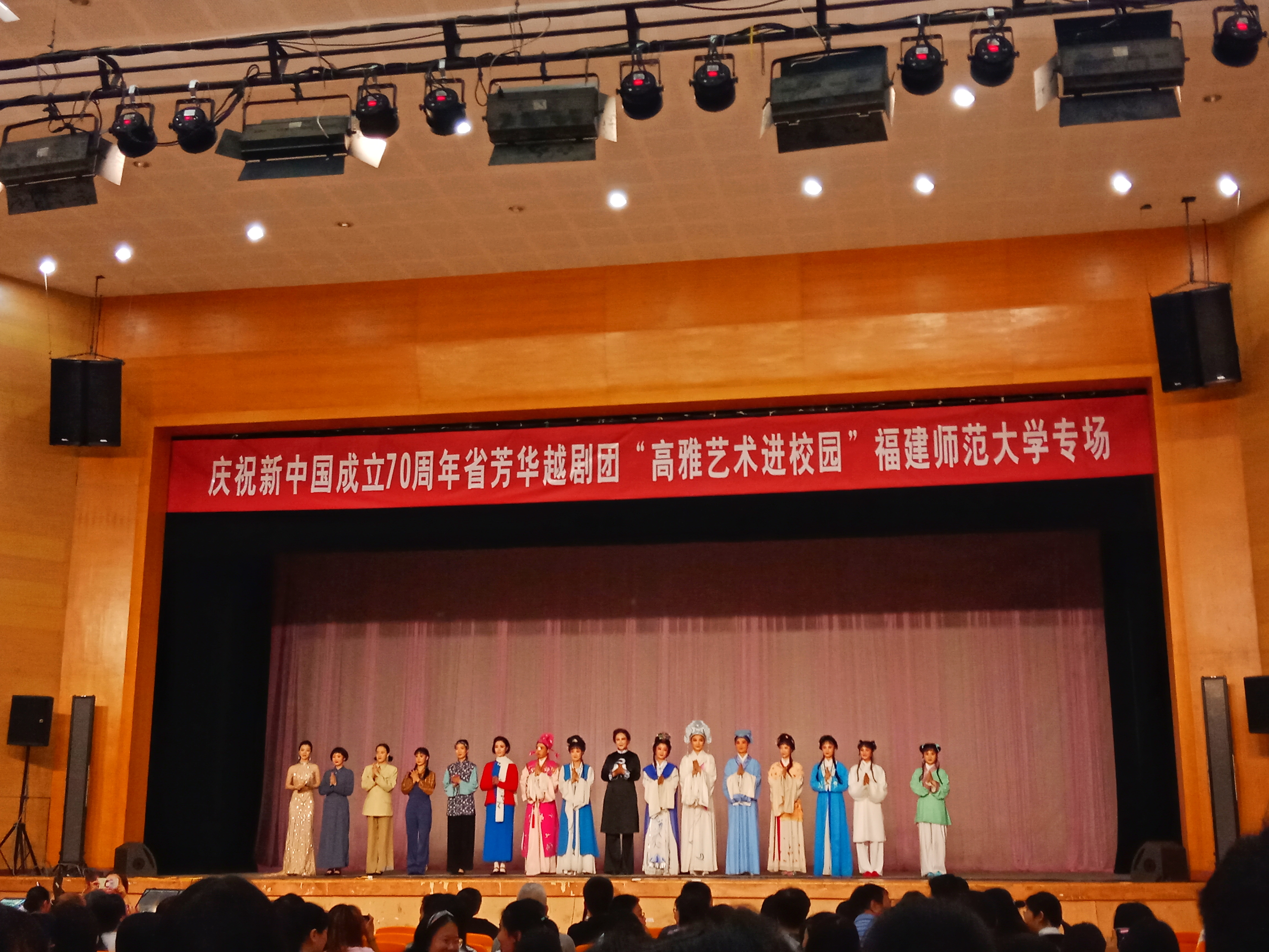 9月29日晚7点,由福建省教育厅、福建省文化和旅游厅、主办,我校承办的庆祝新中国成立70周年芳华越剧团高雅艺术进校园专场演出在青春剧场隆重上演,共吸引了七百余名学生到场观看。