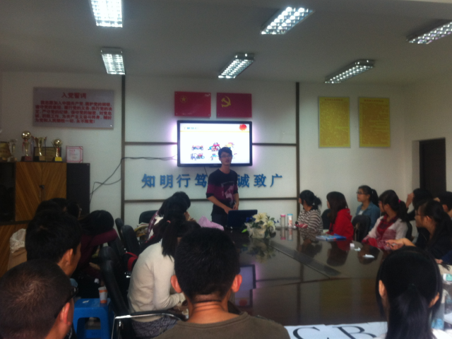 活动开始,先由团支书张燕茹和组织委员苏艇共同组织了残疾人知识及有关残奥会比赛项目的知识竞答活动。接下来进行了表演环节,所有成员被随机分成4个小组表演宣传关爱残疾人的节目,并由观众投票进行打分。期间,所有成员认真投入,气氛活跃。最后由团支书和组织委员再次普及残疾人知识,并对该活动做出总结,升华了活动的主题。