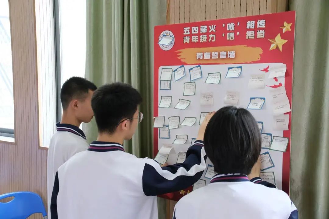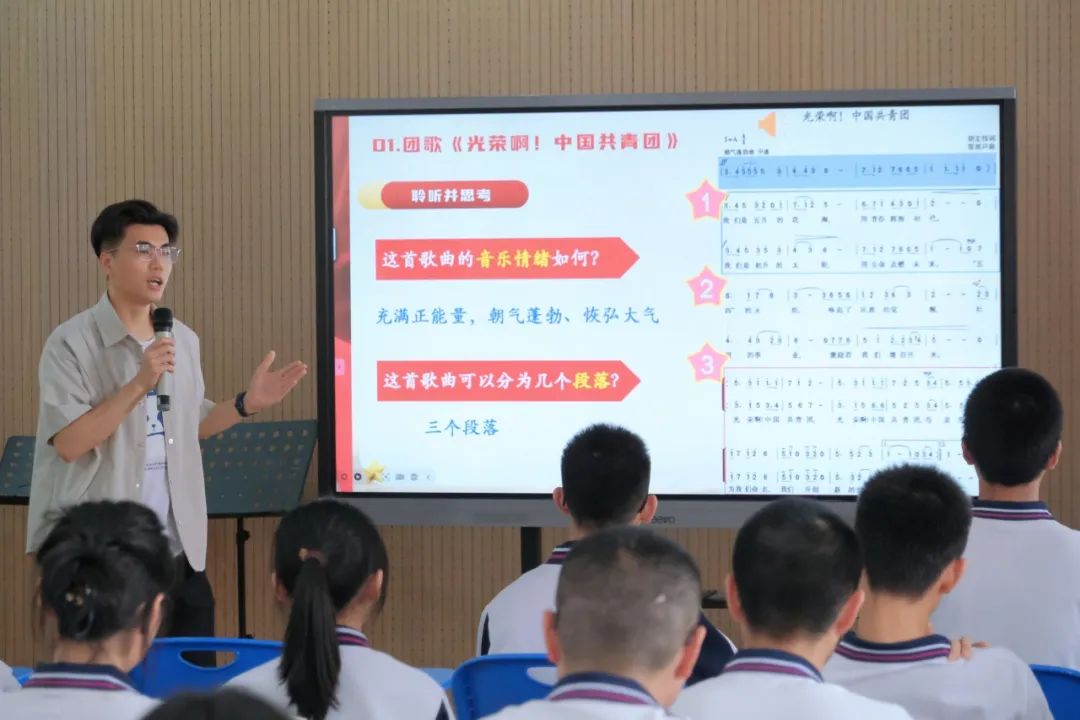 邱绮心的思政课以“五四运动”为切入点,引导学生感悟百年前青年学生的抗争精神,并通过“时光博物馆”的创意形式,搭建起历史与现实的桥梁。这些跨越百年的“青春物证”,让五四精神不再只是课本上的文字,而是学生心中可共鸣的信念,也使思政课成为连接过去、现在与未来的精神纽带。潘峻毅的朗诵课堂以“走进青春、读懂青春、共创青春”为三大核心板块,精心构建起沉浸式的学习场景。课程聚焦李大钊先生的经典作品《青春》(节选),从文本的主旨内核、情感脉络、节奏韵律等维度,通过情景式体验教学,引导同学们穿越百年时空,感受李大钊先生挥毫写下《青春》时的激昂心境。以歌传情、以乐明志,张文彬以音乐为桥梁,通过团歌《光荣啊!中国共青团》的生动教学演绎,将“五四精神”注入跃动的音符,引导学生从旋律中感受信仰的力量,在歌词中探寻青春的答案。