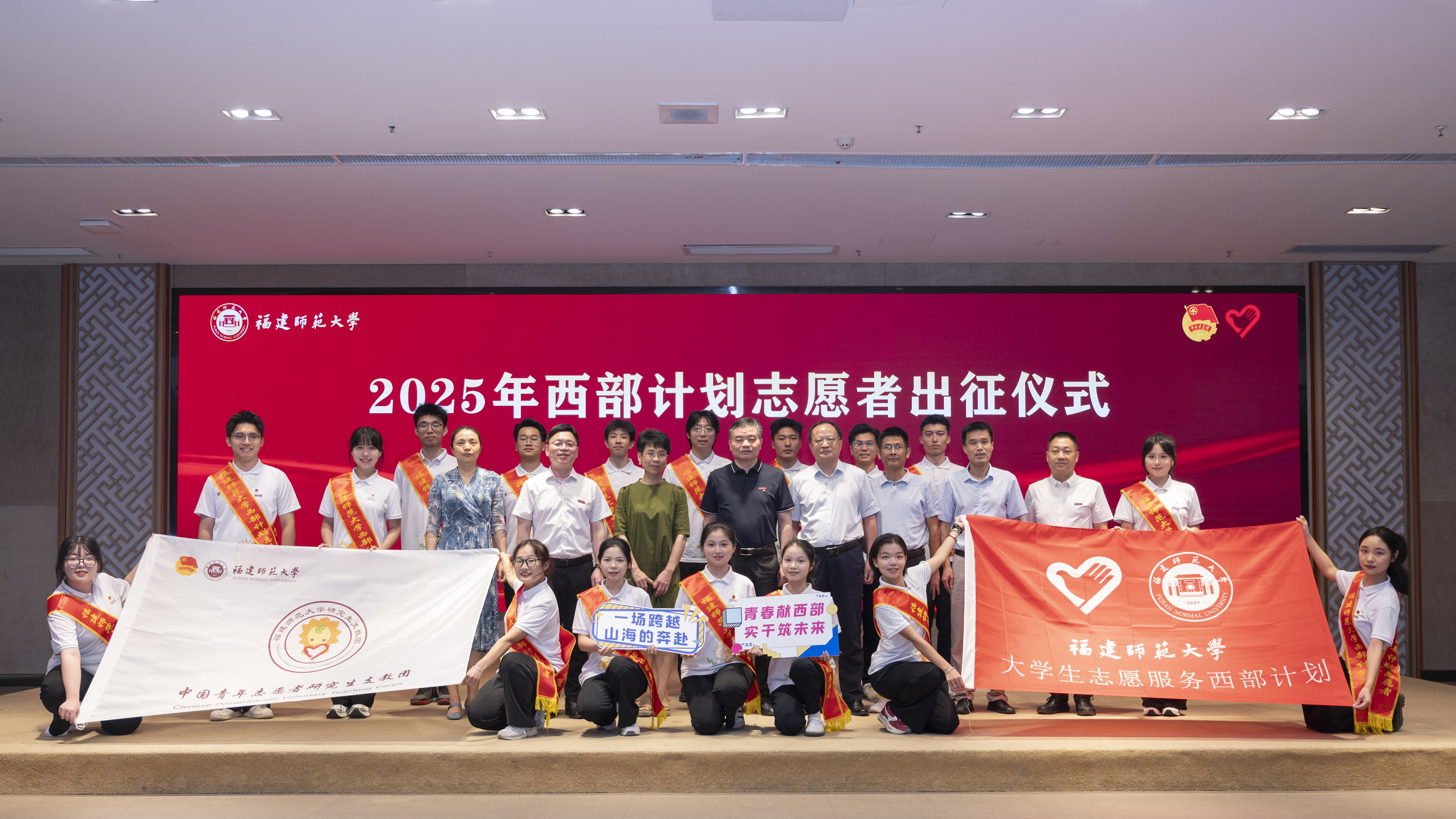 出征仪式于7月2日下午在旗山校区举行,副校长吴剑锋,组织部、宣传部、学生工作部、教务处、研究生院、机关党委、校团委负责人,相关学院分管学生工作负责人、团委负责人,2024、2025年西部计划志愿者代表参加。