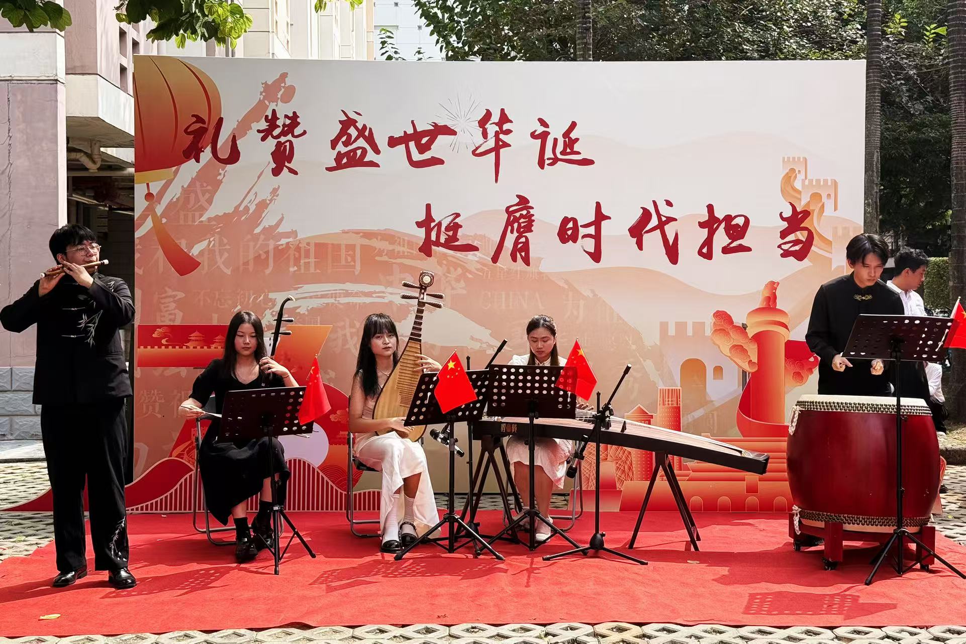 金秋十月,国旗飘扬,校园内洋溢着喜庆热烈的节日氛围。各学院团委、学生会及学生社团精心策划了形式多样、线上线下相结合的庆祝活动,“我和国旗合个影”“弦歌盛世 乐绘中华”“月满华诞 家国同庆”“流沙绵长 敬献祖国”、彩球映祥瑞、非遗漆扇、传统文化展示等,吸引了众多师生前来驻足和参与。大家手持国旗合影留念,定格与祖国同庆的美好瞬间;在趣味挑战中重温家国记忆,用巧手传递深情祝福,在欢声笑语中表达对祖国的热爱之情。