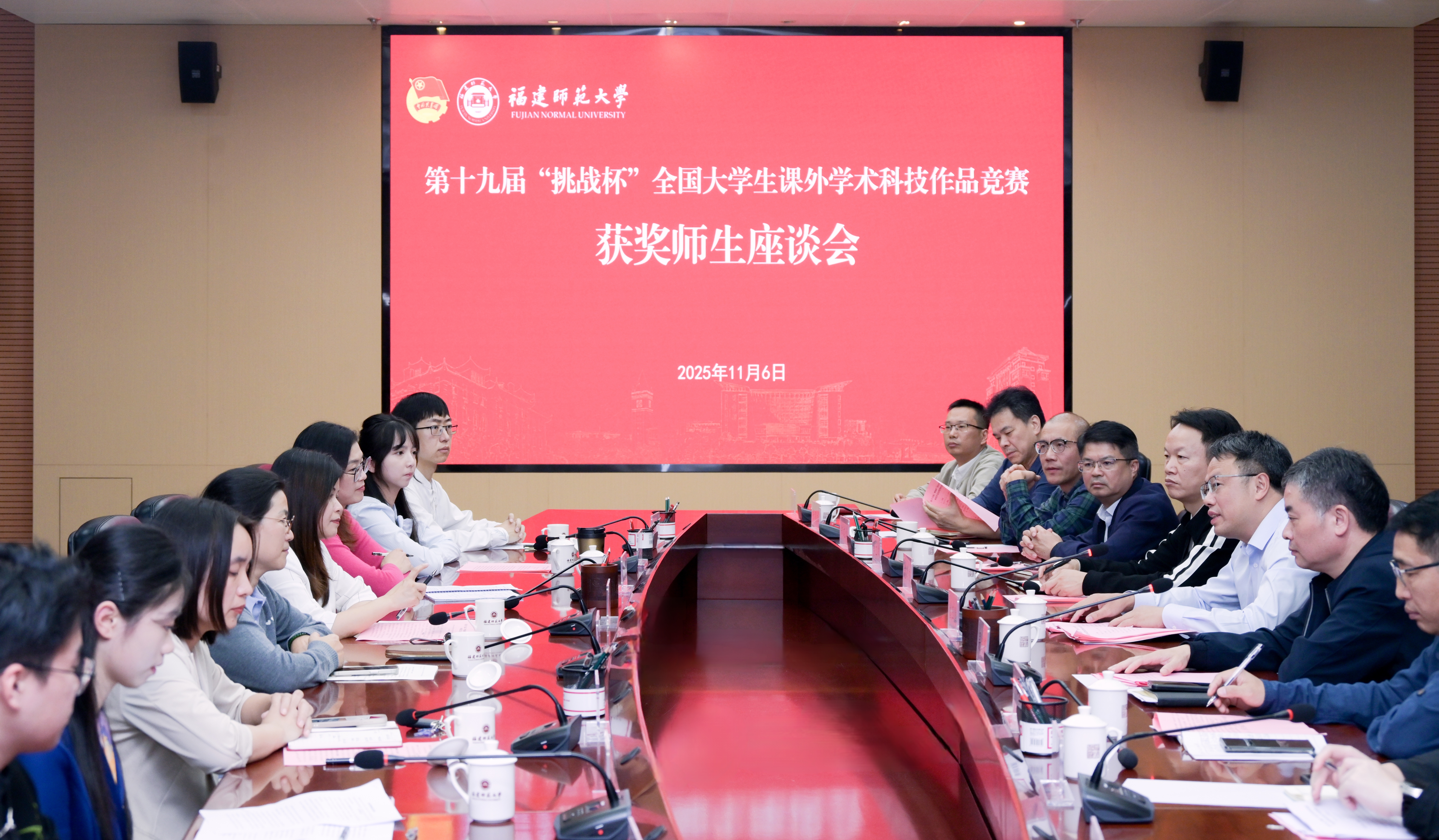 会议于11月6日在旗山校区召开。校党委书记潘玉腾,校党委副书记吴剑锋,党政办公室、宣传部、学工部、校团委等部门负责人,相关学院党政主要领导、分管学生工作负责人,以及获奖团队师生代表参加会议。座谈会由吴剑锋主持。