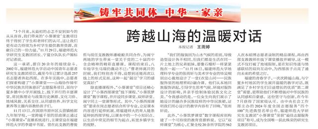 这一承诺,源自20余年的接续奋斗。2002年,福建师范大学启动中国青年志愿者研究生支教团项目,截至今年已累计选派257名志愿者奔赴西部。在多年实践中,志愿者们探索构建了“小葵课堂——山海协作铸牢中华民族共同体意识”志愿服务项目,面向宁夏少数民族聚居的乡镇中小学开展线上、线下并行的丰富课堂,将民族理论与政策历史渊源、文化习俗、地域风貌、关系交往、认同感培养、科学文化素养等主题内容教给孩子们。
