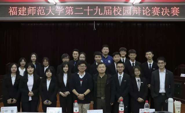 4月13日晚,由校团委主办、校青年通讯社承办的福建师范大学第二十九届校园辩论赛决赛在旗山校区模拟法庭举行。校马克思主义学院副教授,辩论队教练陈志老师、文学院杨祖荣老师、校辩论队前队长陈劲晓老师、2018海峡两岸大学生辩论赛冠军队优秀辩手,校辩论队前队长李新宇、2018海峡两岸大学生辩论赛冠军,2017校辩论赛冠军邱瑜担任本次决赛评委。