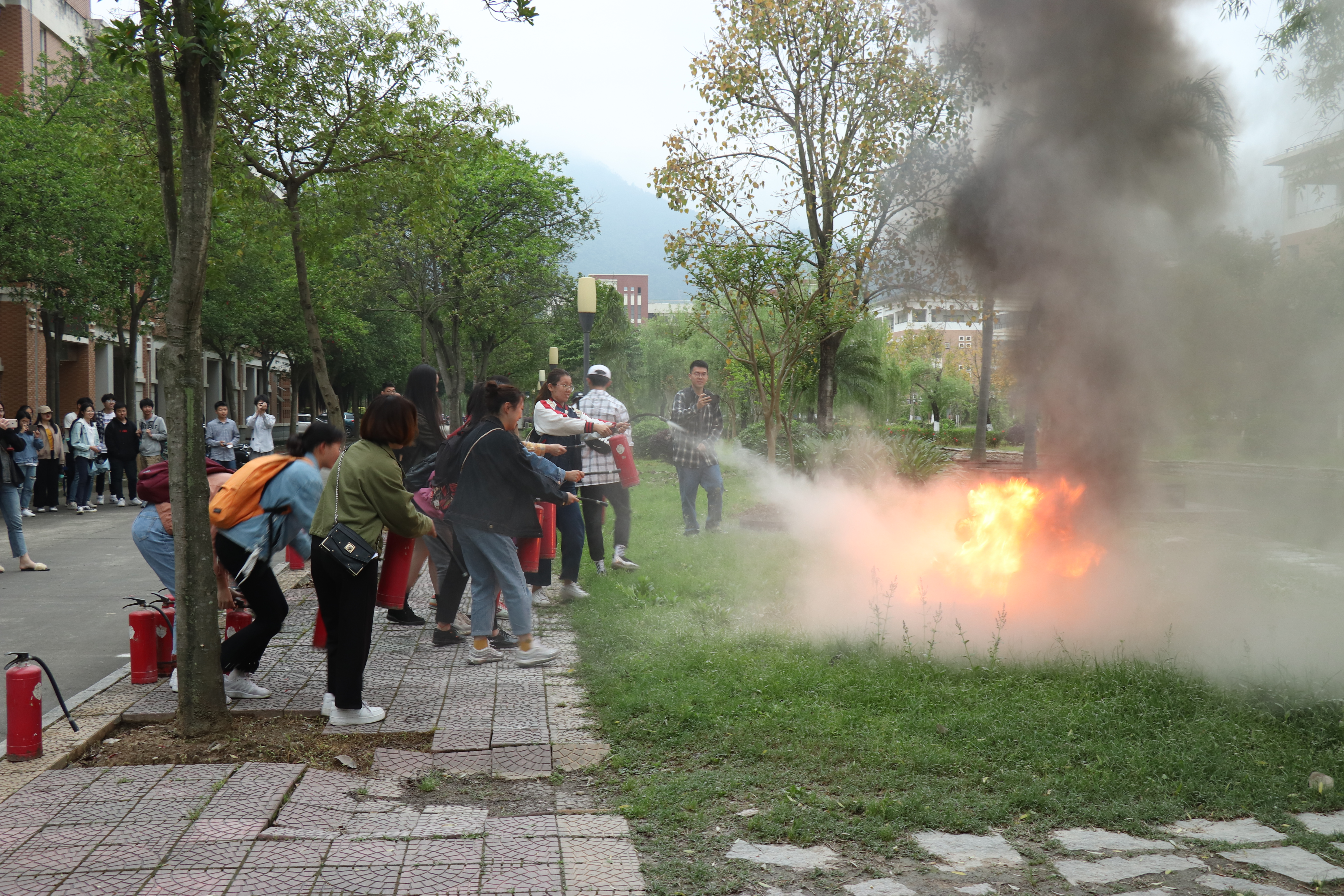在笃行楼5号门前的空地上进行消防演练,保卫处老师现场讲解了常用灭火器的使用方法、注意事项,并按照灭火的正确步骤和方法,指导学生代表体验现场灭火的过程。