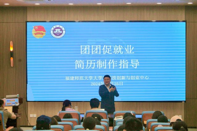 2、10月25日,“团团促就业•就业能力提升指导系列活动”简历制作指导在索莱达大楼一楼报告厅举办。活动由海峡人才市场就业指导名师刘鑫主讲,主要从简历的概述、制作的原则和常见的误区三个方面进行指导。校团委持续扎实开展共青团促进大学生就业行动,抓住秋招季积极开展就业服务,组织开展就业能力提升指导系列活动、就业引航分享交流等活动,引导毕业生积极就业,助力毕业生高质量就业。
