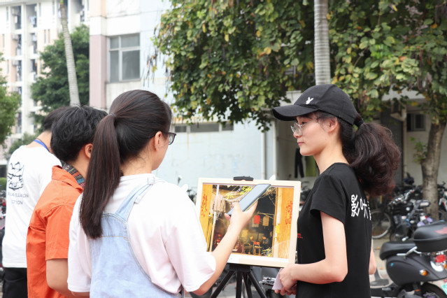 在现场的展出中,也有不少作品的原创者来到现场。“这是我五一出去游玩的时候拍的一张照片,那个时候经过那些楼群就发现了,这里的建筑楼非常老旧,也很有年代感。又刚好看见屋子里有两位老人在聊天下棋,感觉一切都刚刚好,就把这一幕拍了下来。”《静谧午后》的拍摄者,环境科学与工程学院18级董云霞说“我想它可以体现现代化与传统慢节奏文化的交汇,也扣紧这次比赛‘青春芳华,汇声汇影’的主题。”