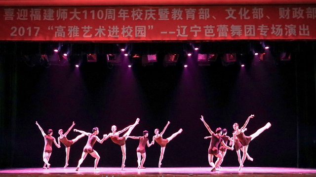 9月11日晚,喜迎福建师大110周年校庆暨教育部、文化部、财政部2017“高雅艺术进校园”--辽宁芭蕾舞团专场演出在青春剧场举行。校党委副书记叶燊与全校1000多名师生一同观看演出。辽宁省芭蕾舞团带来了群舞《悬崖》、双人舞《血色》、女子群舞《巴赫协奏曲》、双人舞《线》以及《化蝶》等作品。其中,压轴作品《化蝶》由葡萄牙籍编舞大师创作编排,刻画了梁山伯与祝英台以及马文才三人的少年、同窗、婚约、哭坟、化蝶故事,手法精炼、大开大合、写意唯美,将中国古代经典传说《梁山伯与祝英台》演绎的淋漓尽致。现场掌声不断,观众反应热烈。
