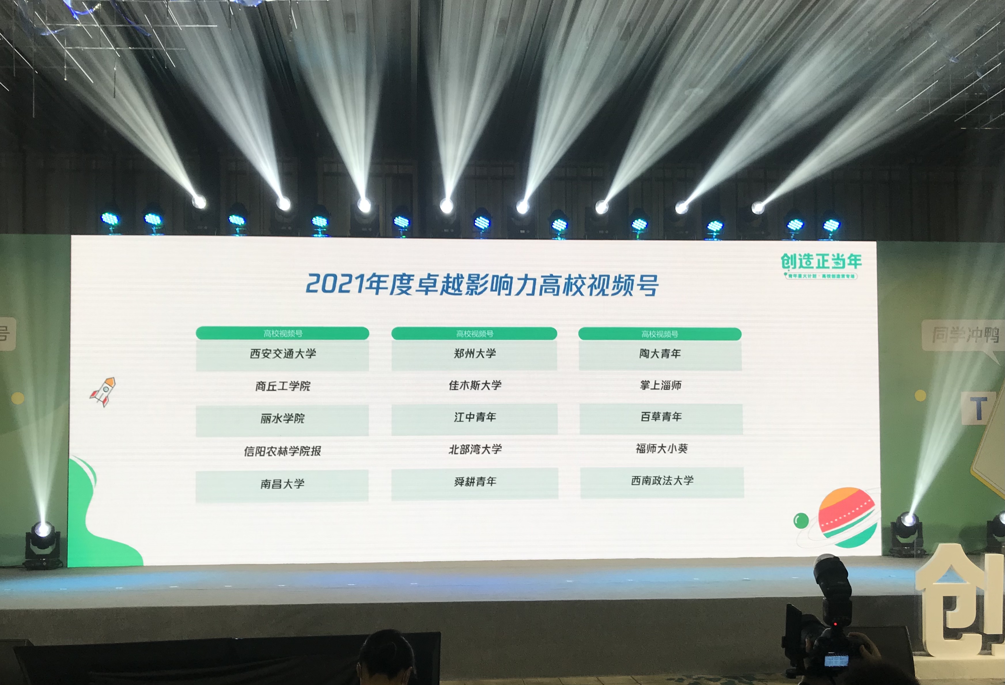 5月7日,“创造正当年—2021高校视频号创造营”在深圳举办,上百所高校的老师、同学跨越南北,齐聚活动现场,分享交流高校视频号创作经验。活动现场,共青团中央宣传部传播处处长王小鲲,中国青年报校园部主任、中青校媒执行秘书长曹竞,中国青年报、中青校媒副秘书长蔡华丽,共青团中央新媒体中心编辑戴胤,腾讯公司微信战略研究中心副总监张柳燕为“2021年度卓越影响力高校视频号”和“2021年度影响力高校视频号”颁发奖杯。