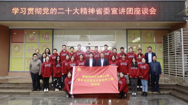 2022年11月16日,福建师范大学学习贯彻党的二十大精神学习宣讲报告会在旗山校区举行,宣讲报告会由省委宣讲团成员、校党委书记潘玉腾教授主讲。校青马班学员在小葵馆分会场通过在线视频的方式聆听了报告会。会上,潘书记对党的二十大精神加以全方位解读,他强调,要提高政治站位,明确宣讲任务,从深刻领悟“两个确立”的决定性意义、坚决做到“两个维护”的政治高度,充分认识开展集中宣讲的重要意义,以高度的政治责任感和历史使命感,推动党的二十大精神走深走实走心;围绕党的二十大提出的重要思想、重要观点、重大战略、重大举措,紧密结合福建实际、教育实情、师生关注,找准研究阐释的结合点、切入点,用好数据化、可视化素材,以学促研推动宣讲成果最大化。