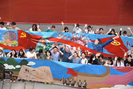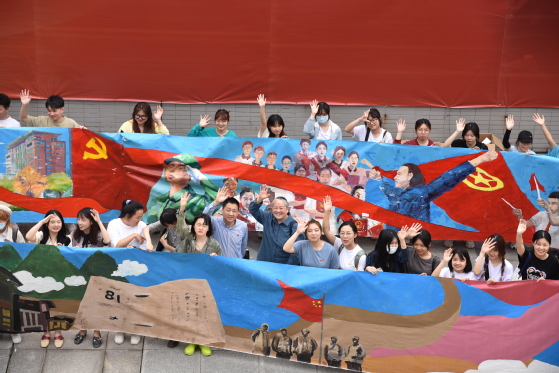 活动现场,美院师生和其他学院同学们手执画笔绘制长卷,共同勾勒中国共产党成立100年的光辉历程以及取得的举世瞩目的成就,讴歌新时代发展的成绩。绘卷上,解放军战士热血奋发,伟人形象伟岸高大,国旗党旗鲜艳飞扬。活动现场气氛热烈,有学生说到:“像是与党再一起经历这百年辉煌一样,心里的骄傲都快溢出来了!”
