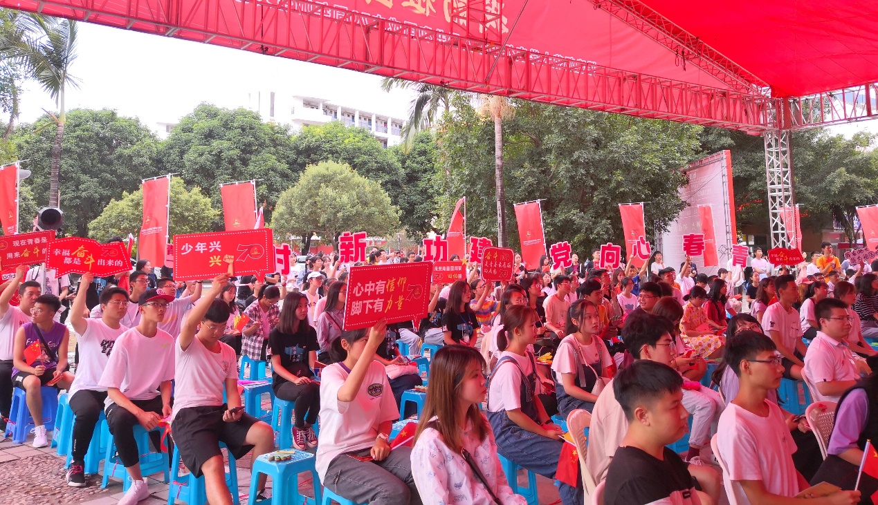 师生文艺汇演后,校领导还与师生在共青团广场、宏达厅和星雨剧场共同收看了庆祝大会和阅兵式直播。