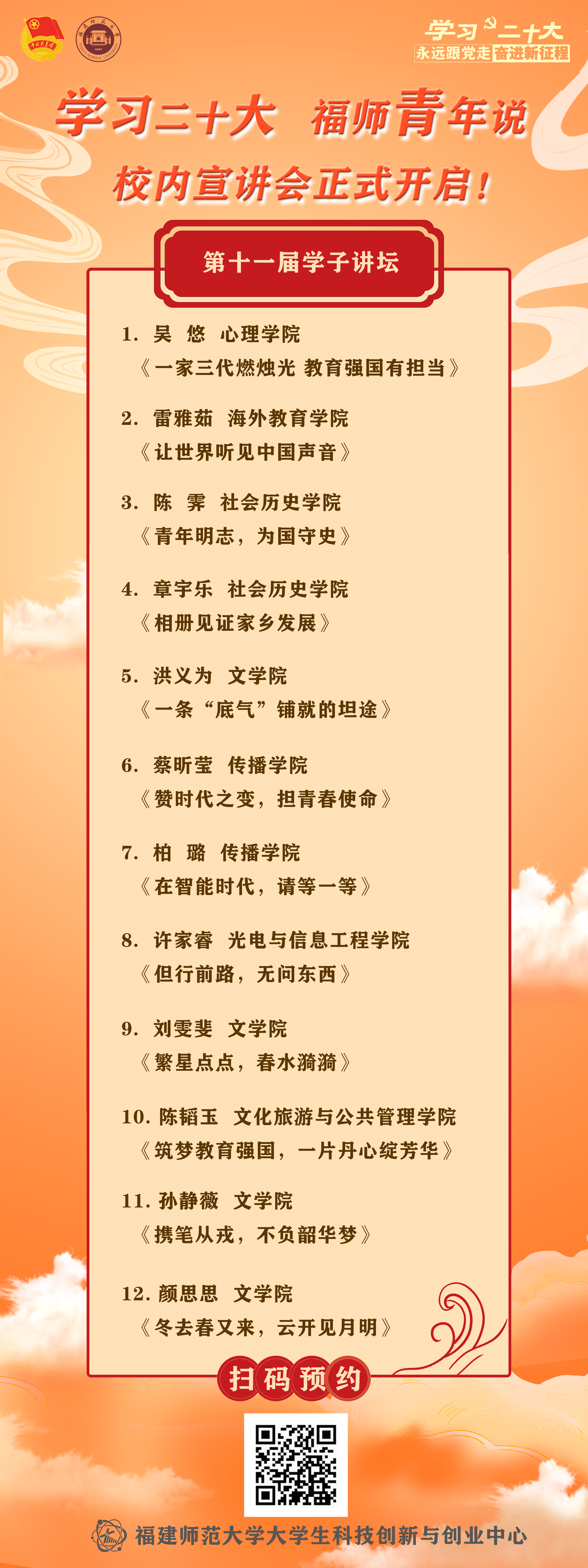“学子讲坛”由校大学生科技创新与创业中心承办,深受同学欢迎。本届学子讲坛以“学习二十大 福师青年说”为主题,引导青年学生学习党的二十大精神,立志做有理想、敢担当、能吃苦、肯奋斗的新时代好青年。初赛收到报名作品百余件,52人入围复赛。“为时代发声,为青春代言”,青年学生聚焦发展成就、文明文化、社会万象、美丽心灵和青年担当等主题发表真知灼见,充分展现了福师青年的精神风貌。