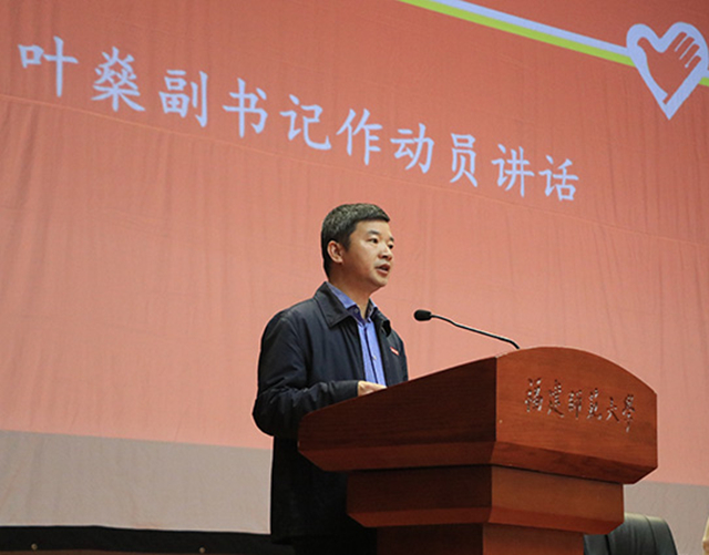 动员大会上,叶燊副书记向校庆志愿者表示祝贺和感谢,他表示,校庆志愿者是向海内外校友和社会各界展示新一代福师大人良好精神面貌的重要窗口和平台,学校党政领导对校庆志愿者高度重视,寄予厚望,希望志愿者认真接受服务技能的培训,努力提高服务水平和应变能力,切实增强责任感和使命感,保质保量完成各项工作任务,当好学校精神和文化的传播者、弘扬者和实践者,彰显师大人的情怀和担当;希望相关部门、学院支持配合,按照“谁使用、谁管理、谁保障”的原则,统筹好志愿者的交通、餐饮、住宿、安全、补贴等问题,为志愿者解决后顾之忧。