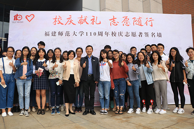 2017年11月8日下午,由校团委主办的福建师范大学110周年校庆志愿者动员大会暨志愿者通用课程培训在旗山校区图书馆大会堂举行。校党委叶燊副书记、学校办公室、校庆办公室、学工部、研工部、校团委、各学院带队老师和800余名校庆志愿者参加了动员大会。
