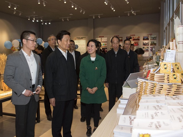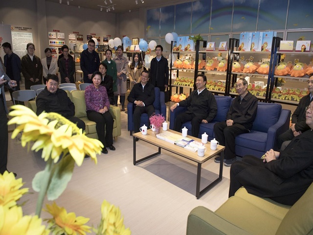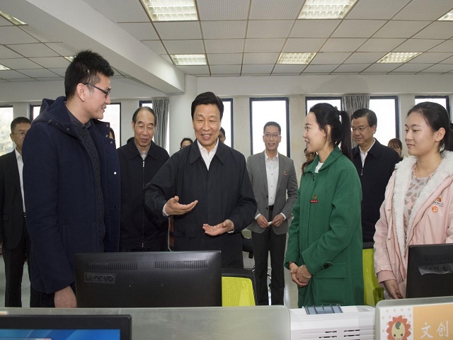 李源潮副主席走进小葵新媒体工作室,与正在进行青年之声、微博、微信、易班等平台运营的同学进行互动交流,参观了同学们自主开发的网络文创产品,关切地询问大学生的网络使用情况,听取了关于《“五微五阵地”开辟网络育人新天地》的工作汇报。