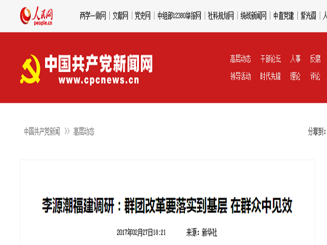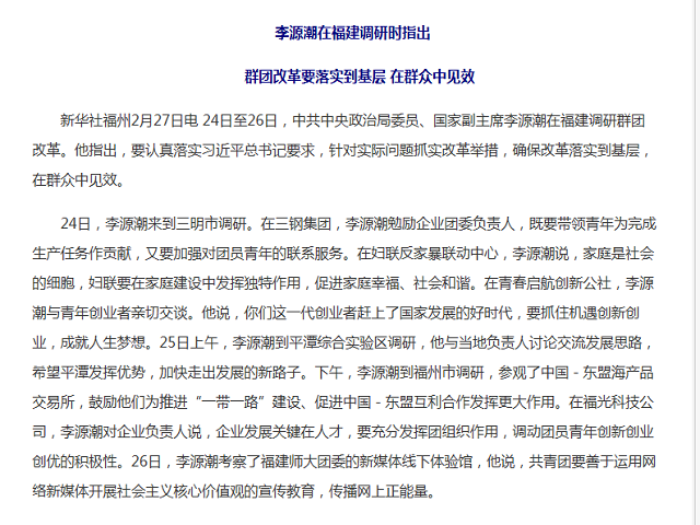 2月27日《新华网》以《李源潮在福建调研:群团改革要落实到基层 在群众中见效》为题 ,报道中共中央政治局委员、国家副主席李源潮一行到我校小葵馆考察调研“网上共青团”建设工作情况,报道如下:
