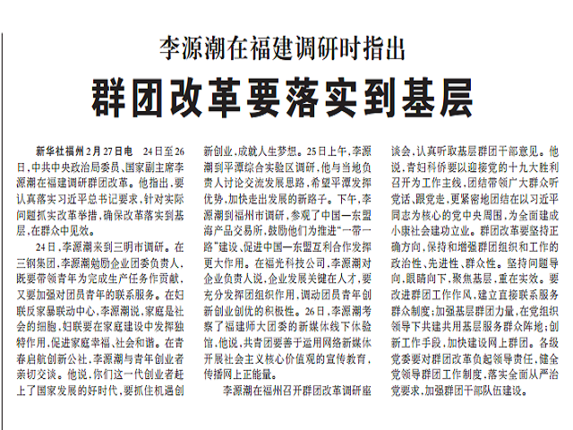 [福建日报]李源潮福建调研时指出:群团改革要落实到基层