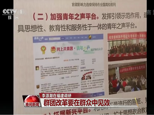 2月27日CCTV-1《晚间新闻》以《李源潮在福建调研 群团改革要在群众中见效》为题 ,报道中共中央政治局委员、国家副主席李源潮一行到我校小葵馆考察调研“网上共青团”建设工作情况,报道如下: