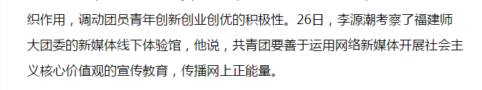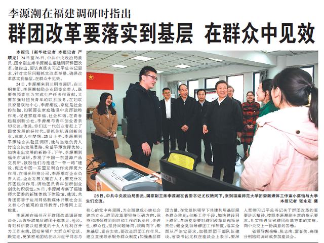 2月27日《福建日报》01版以《李源潮在福建调研时指出:群团改革要落实到基层 在群众中见效》为题 ,报道中共中央政治局委员、国家副主席李源潮一行到我校小葵馆考察调研“网上共青团”建设工作情况,原文如下: |