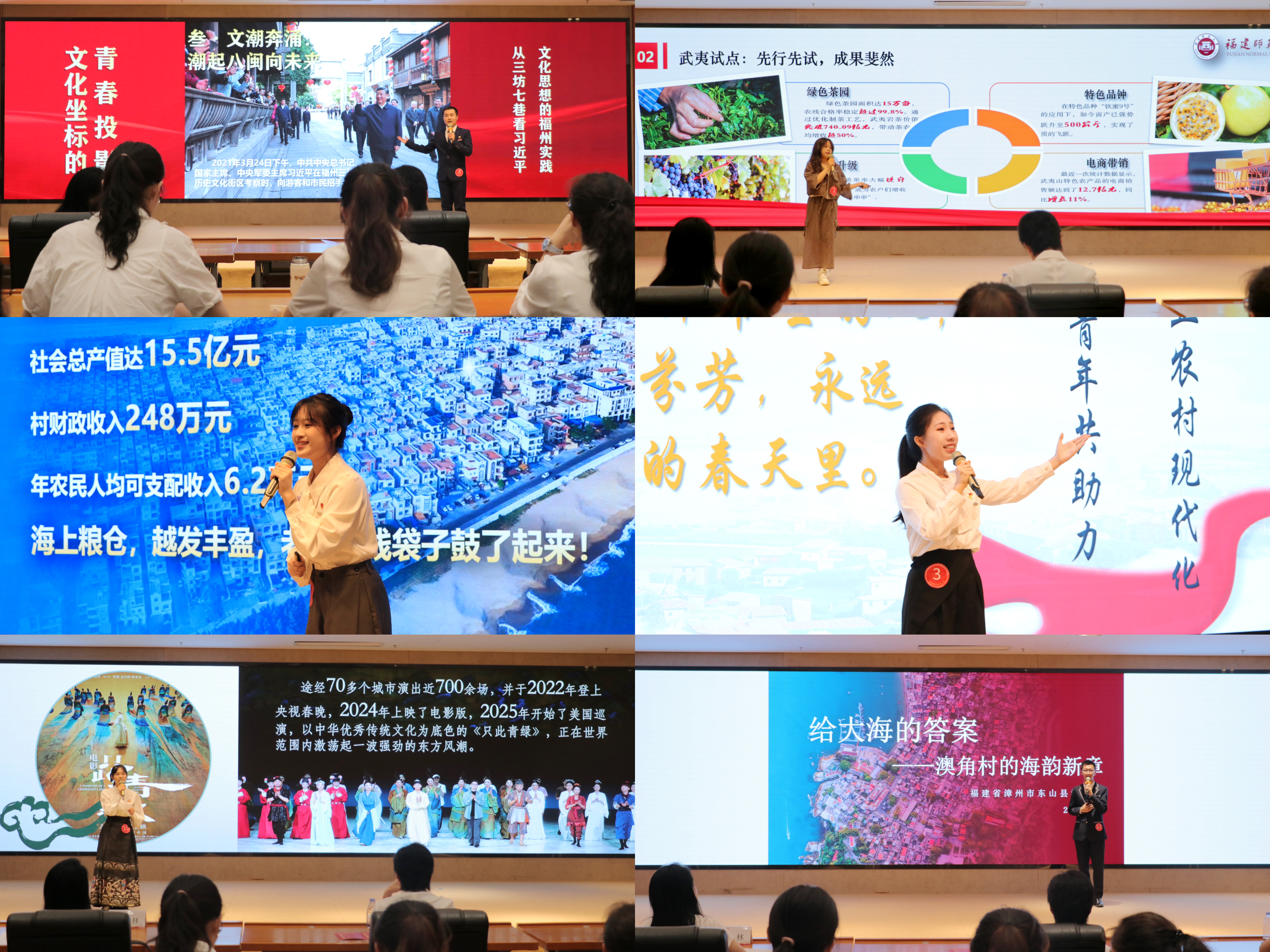 决赛现场,选手们围绕乡村振兴、文化传承、科技创新、生态建设等主题,通过生动的故事讲述、精彩的案例分析和富有感染力的表现,展现了新时代青年对党的创新理论的深刻理解和对国家发展的热切关注。选手们以饱满的热情和扎实的内容传递青春力量,充分体现了师大青年学子的思政素养和创新精神。选手展示后,黄雯老师对选手们的讲课方式、教学互动、仪表仪态等提出建议,并对作品进行点评。最终,马克思主义学院《绿海寻路,为民而行》、社会历史学院《文化坐标的青春投影:从三坊七巷看习近平文化思想的福州实践》荣获一等奖。