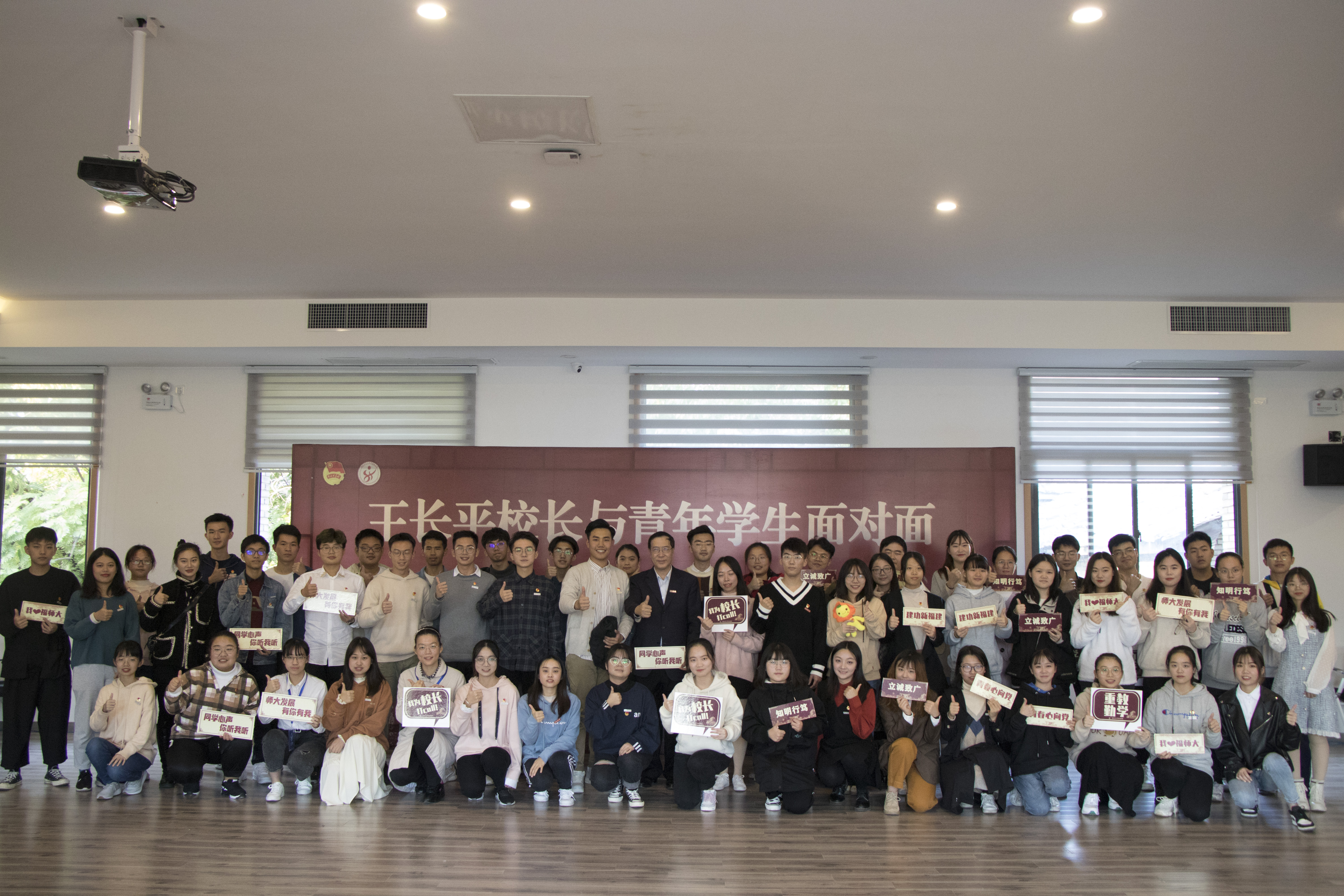 12月15日,第十二期“王长平校长与青年学生面对面”活动在仓山校区五号楼四楼教工活动中心举行。王长平校长带领学校办公室、宣传部、学工部、保卫处、教务处、招生与考试中心、研究生院、财务处、后勤处、基建处、网络与数据中心、校团委、图书馆、体科院等单位负责人,与从网络报名的同学中抽选的90名青年学生代表齐聚一堂,聊梦想、讲问题、谈建议、献良策。活动由校学生会执行主席史祺桢同学主持。