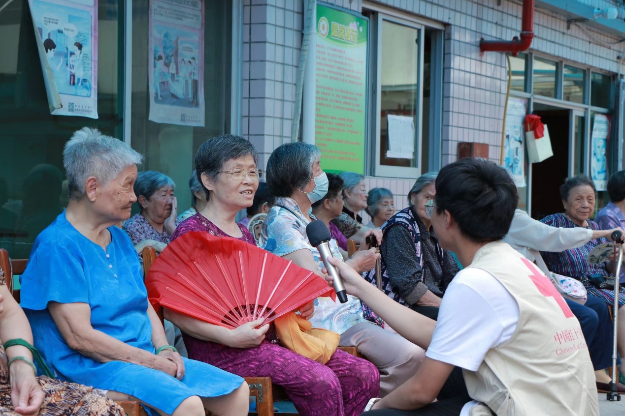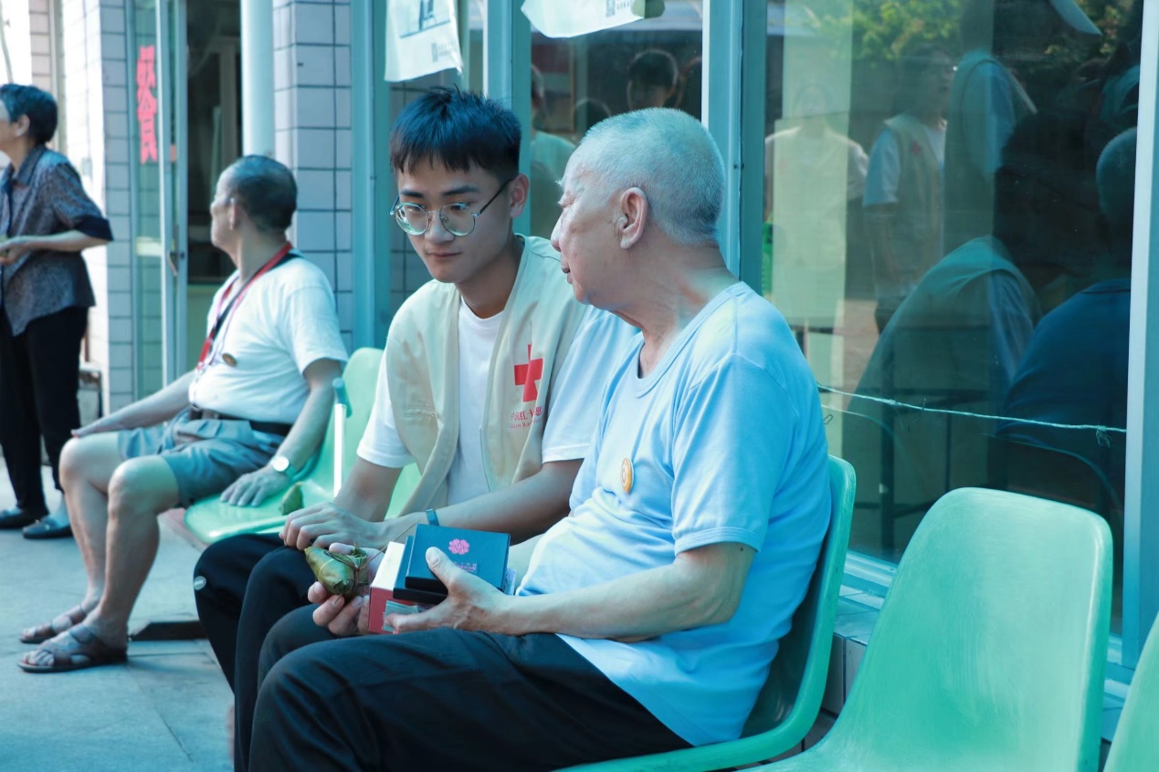 在老人们早操结束后,广场上我校校红会成员通过向老人们展示太极表演拉开了本次活动的序幕。接着,由救护培训部细致耐心地讲解夏天生活保健知识。全体成员合唱《我和我的祖国》后,在场的爷爷奶奶上台表演了《没有共产党就没有新中国 》、《茉莉花》、《 常回家看看》等歌舞。老人们与志愿者们一起下象棋、折纸花、写祝福,现场一片祥和。中午时分,为老人准备好的热气腾腾的粽子端上了鸿儒老年乐园的餐桌,同学们为老人剥粽子,同吃午饭,此次活动在一片欢声笑语中圆满结束。