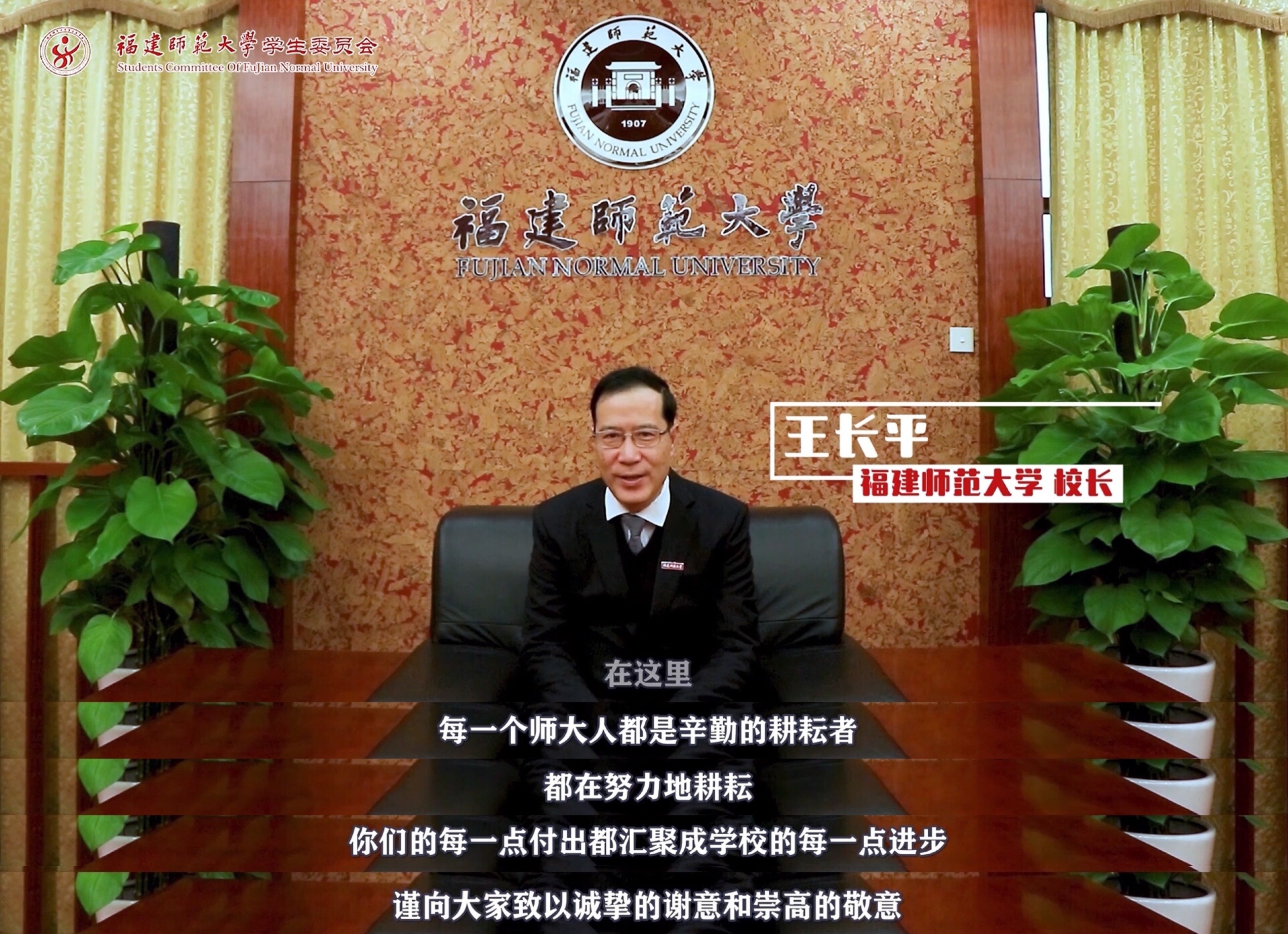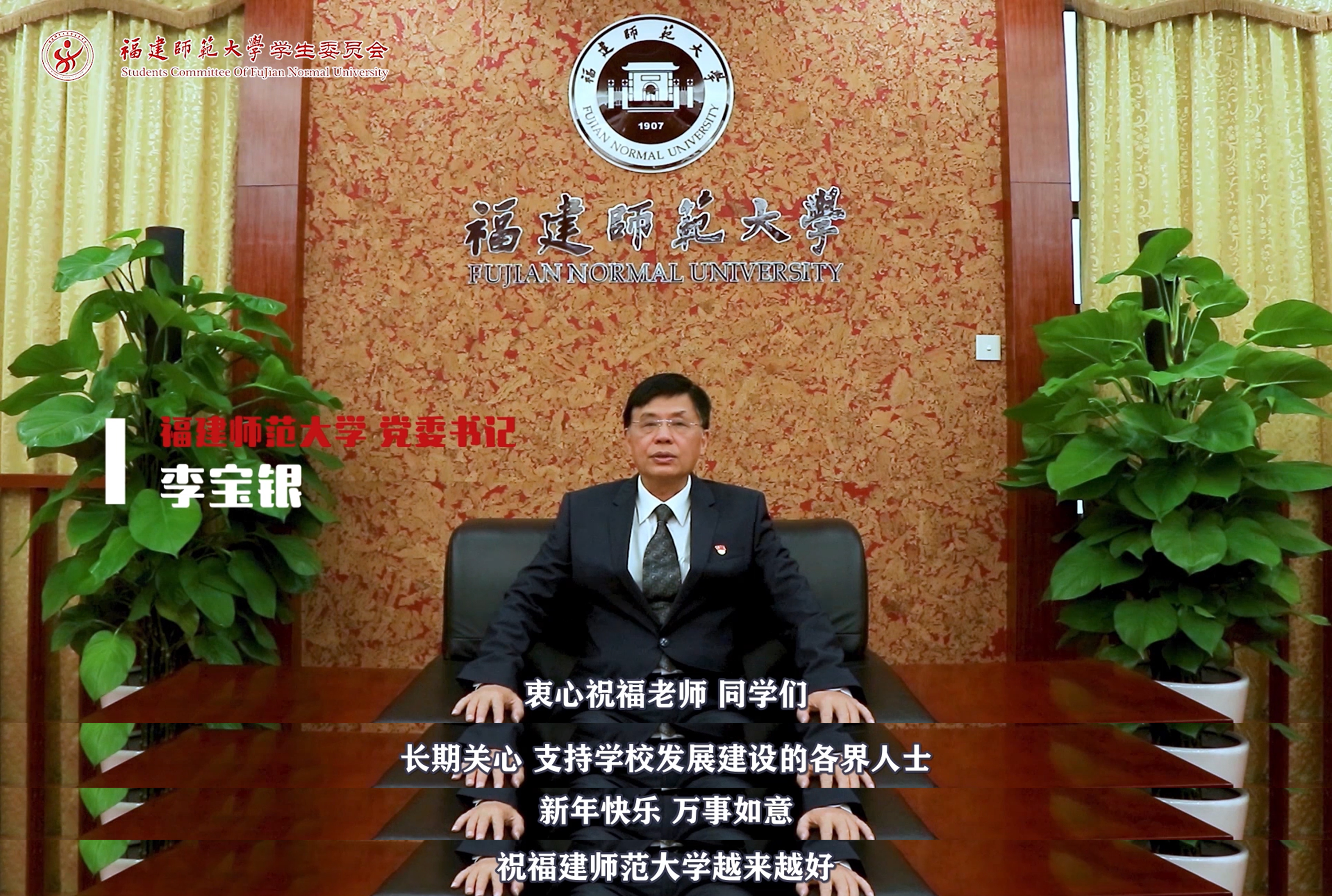 在晚会现场,展播了校党委书记李宝银、校长王长平的新年祝福视频。校党委书记李宝银代表校党委,向全体老师、同学、海内外校友致以新年的祝福!衷心希望同学们在习近平新时代中国特色社会主义思想的指引下,树立远大理想、热爱伟大祖国、担负时代责任、勇于砥砺奋斗、练就过硬本领、锤炼品德修为,同人民一道,为建设机制活、产业优、百姓富、生态美的新福建、实现中华民族伟大复兴的中国梦贡献青春力量。校长王长平代表学校,向全体师生员工、离退休老同志、海内外校友,向关心支持学校事业发展的社会各界朋友,致以节日的问候和衷心的祝愿!衷心希望所有师大人重整行装再出发,砥砺奋进攀高峰,扎实推进学校“双一流”建设再上新台阶,以更加优异的成绩,迎接第一个百年奋斗目标的实现!