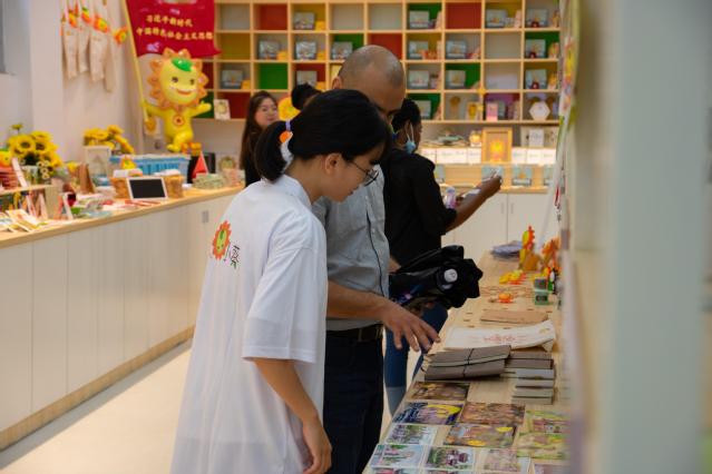 返校后,留学生代表走进福师大小葵馆进行参观,学生讲解志愿者通过小葵建党百年系列文创产品创作讲解、原创视频播放,向留学生生动形象的宣传解读习近平新时代中国特色社会主义思想的精髓与内涵,介绍了中国共产党百年光辉历程。
