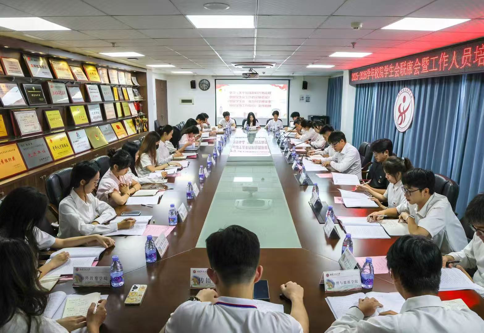2025年9月24日下午,2025-2026学年校院学生会联席会暨学生会工作人员培训会在团委楼303召开。校团委金程远老师、校学生会主席团成员、各学院学生会主席团代表参加会议。本次会议由校学生会主席团成员庄钧主持。