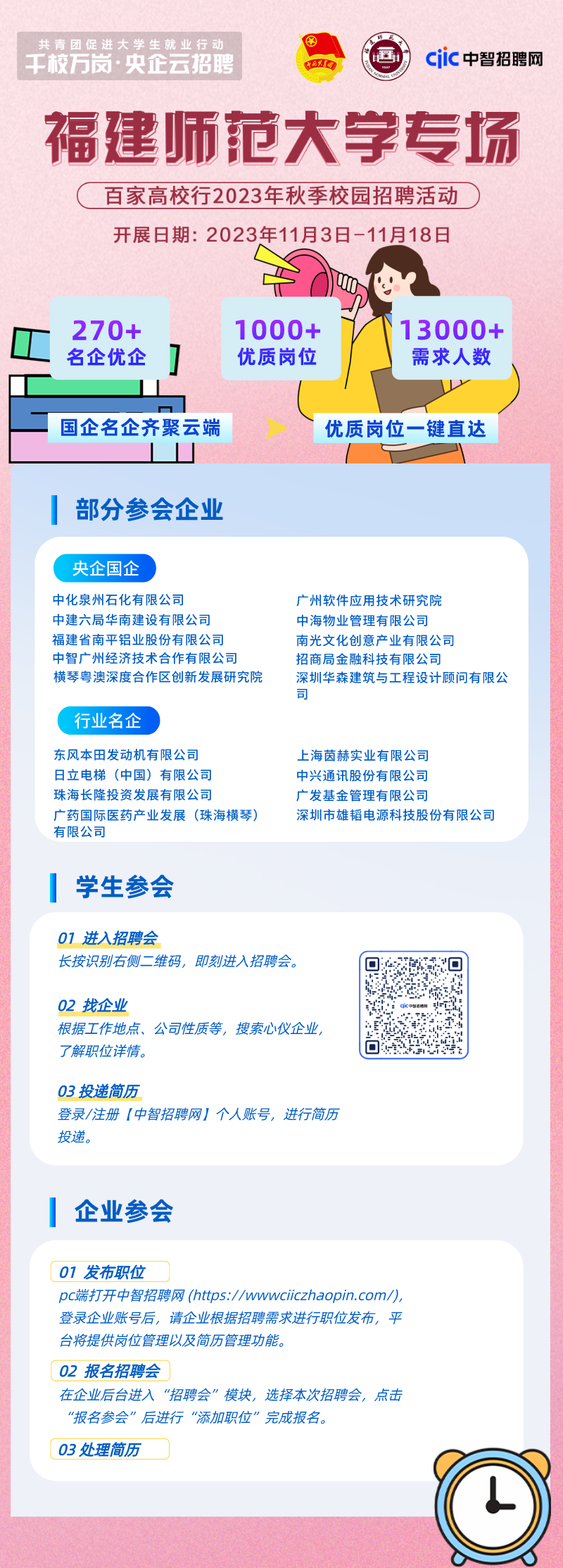 “千校万岗·央企云招聘”百家高校行2023年秋季校园招聘活动11月3日-11月18日举行,活动由共青团中央青年发展部主办,中国国际技术智力合作集团有限公司和我校团委承办。该活动全力为2024届高校毕业生搭建优质就业平台,以扎实举措做好青年就业服务工作。