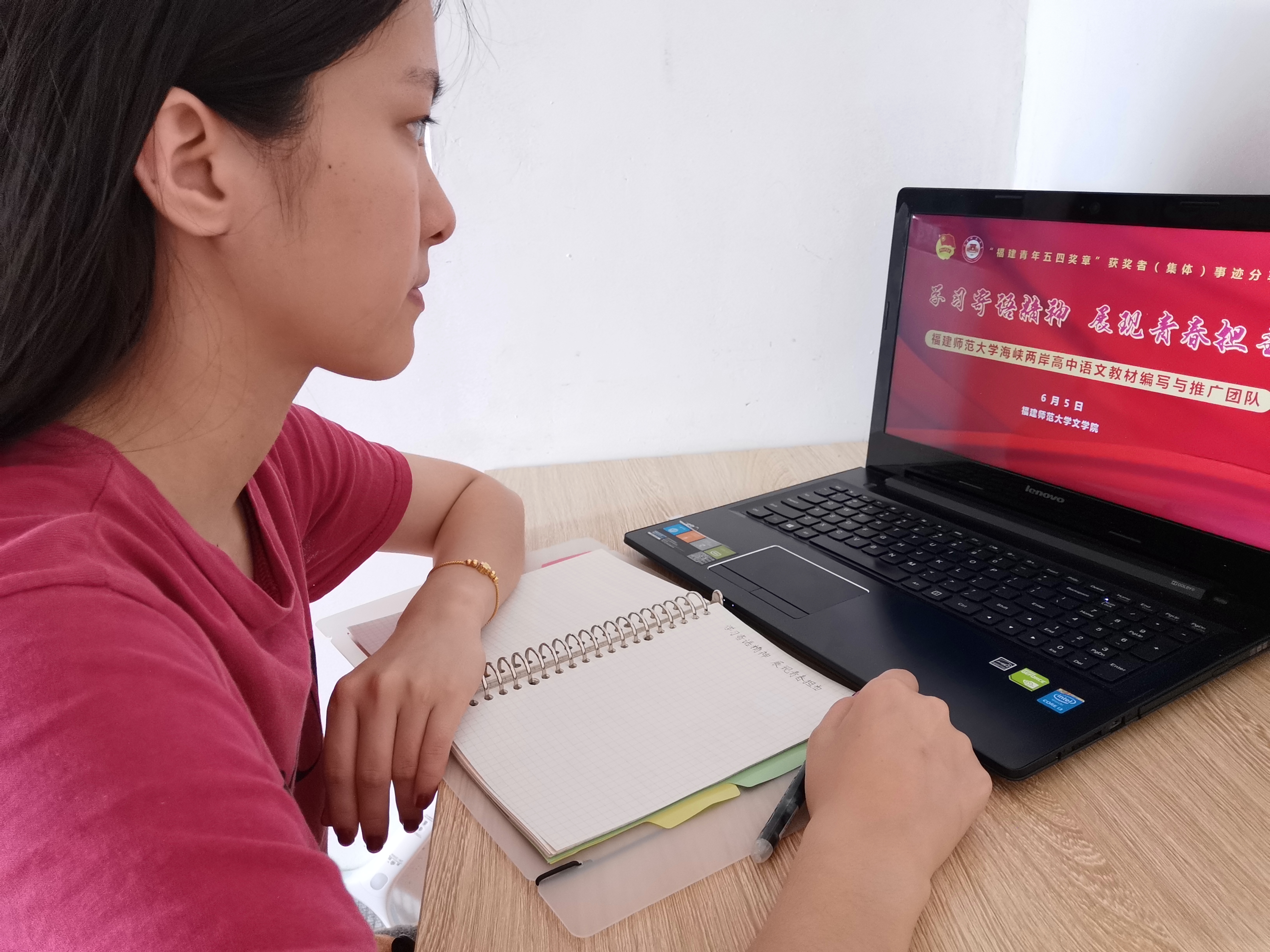 6月5日,文学院团委邀请2020年“福建青年五四奖章(集体)标兵”获得者---福建师范大学海峡两岸高中语文教材编写与推广团队代表与2019级研究生共同学习五四寄语,分享青春奋斗历程。活动中,师生共同观看了团队事迹宣传短片,听取团队情况介绍。随后,团队代表分别分享了团队在教材编写、赴台推广、两岸文教交流等工作背后的故事,让大家更深的体会到团队工作的价值与意义,以及工作的艰辛和不易。分享会上,团队成员还和学生们分享了在文学创作、学术科研、两岸文化交流以及职业规划发展等方面的内容。分享过后,团队成员代表张晓岚老师为学生开展《牢记初心使命 磨砺多彩青春》主题团课,带领学生共同学习2020年习近平总书记五四寄语精神,结合团队事迹,鼓励学生将个人奋斗与国家需要紧密结合,担当时代使命,在磨砺中成就青春,在奋斗中升华人生。