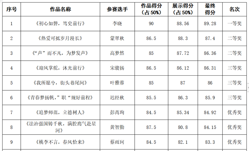 经过激烈的角逐,大赛共评出一等奖1名,二等奖2名,三等奖3名,优秀奖3名。社会历史学院黄敬兵、传播学院陈丹丹获评大赛优秀指导老师。