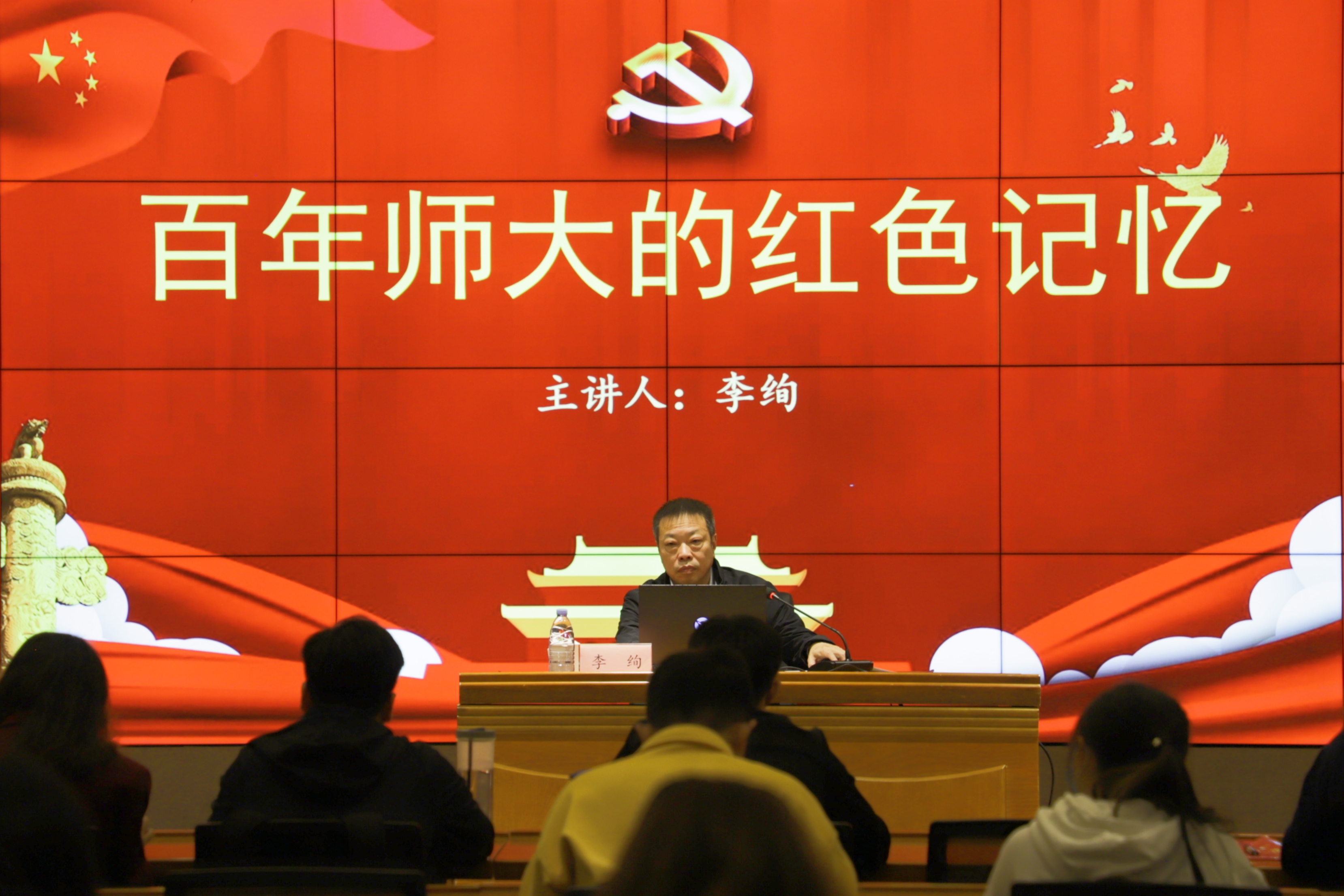 李绚讲述了五四运动、土地革命、抗日战争、解放战争等各个历史时期我校涌现出的革命先烈、校友先贤的生动故事,系统阐述了百年师大的奋斗历程和光荣革命传统,在百年党史中探寻校史精神。他向广大青年学生提出三点希望,一是深铸理想信念、争做新时代“爱国者”;二是练就过硬本领、争做新时代“攀登者”;三是强化责任担当、争做新时代“奋斗者”。