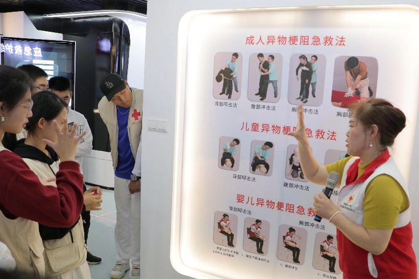 同学们在应急救护综合教学区、交通安全体验区、水上安全体验区、消防安全体验区等处进行参观,在讲解员的耐心指导下,认真学习了心肺复苏、气道异物梗阻处理、溺水急救方法、各类绳结打法等应急救护技能。现场同学们热情高涨,积极参与应急救护技能实操。