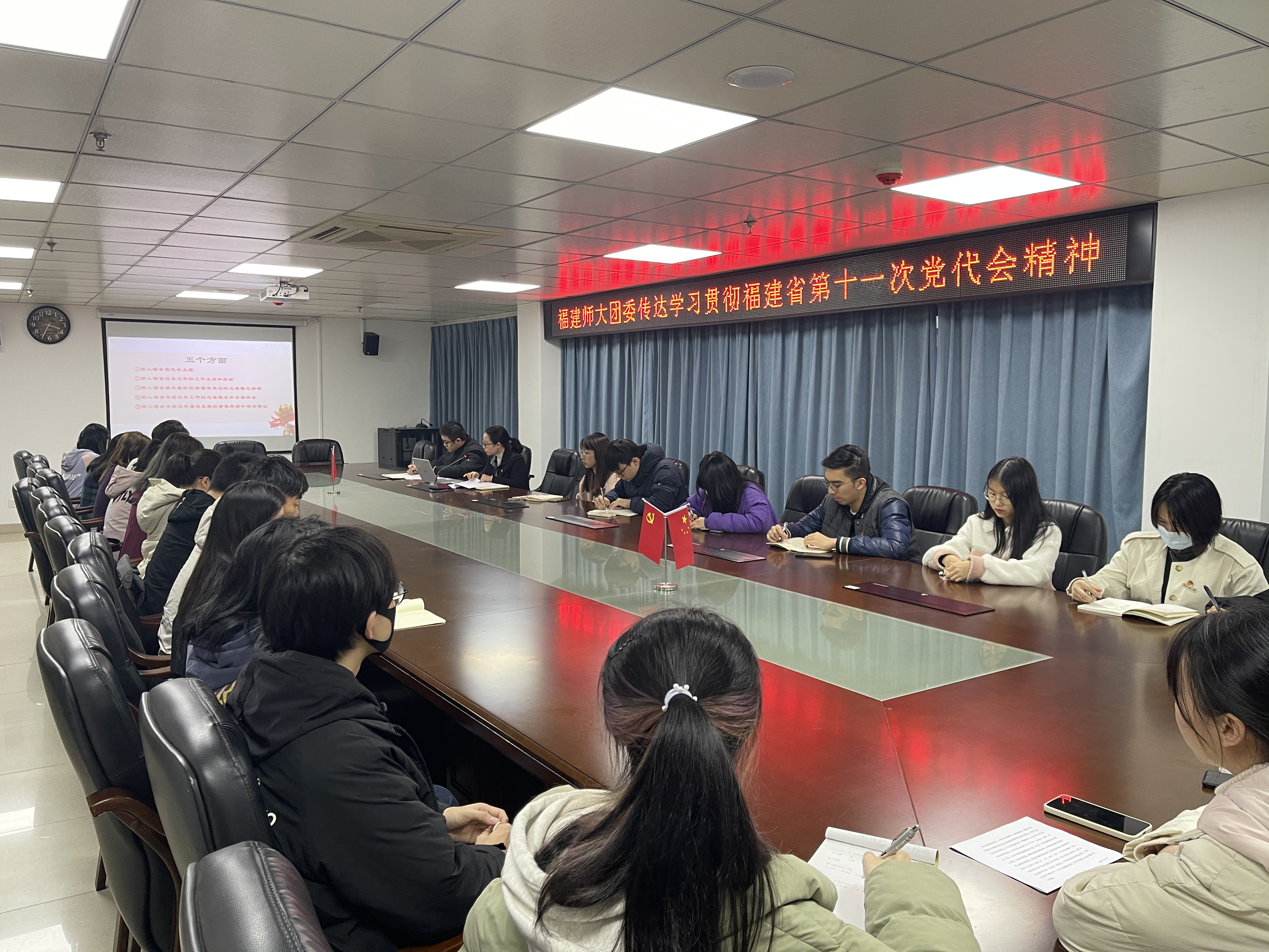 吴小英传达了会议精神,省第十一次党代会是在建党一百周年之际,在向第二个百年奋斗目标迈进的重要时刻,在全省深入学习贯彻党的十九届六中全会精神的关键节点,召开的一次重要会议。要全面准确学习领会党代会精神,从“五个方面”深入领会党代会精神,从“十个方面”贯彻落实,始终做到“六个必须”,深刻认识习近平总书记对福建工作的重要要求和党中央决策部署,是福建发展的总纲领总遵循。她指出,党旗所指就是团旗所向,校院两级团学组织要把学习贯彻省第十一次党代会精神作为当前和今后一个时期的重要政治任务,学习好、宣传好、贯彻好党代会精神,更好履行党赋予的职责使命,更好团结带领广大团员青年发挥生力军和突击队作用,始终紧跟党走在时代和青年的前列。