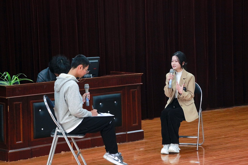 在第二环节中,晋级的四位选手以校园记者的身份开启现场采访。四位选手都展示了他们良好的控场能力和记者风采。王选辉老师在点评中,谈到应当明确采访侧重点,捕捉有用信息,并鼓励选手们善于发现受访者的与众不同之处,去书写他们的个人风采。