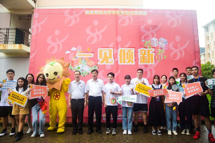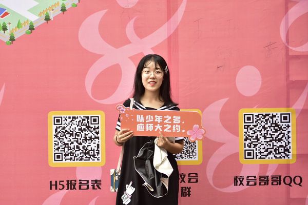校学生会设计制作“一见倾‘新’”主题合影墙,提供“以少年之名,应师大之约”、“一入福师大,即是师大er”手持板,吸引了大批新生前来签名、合影。