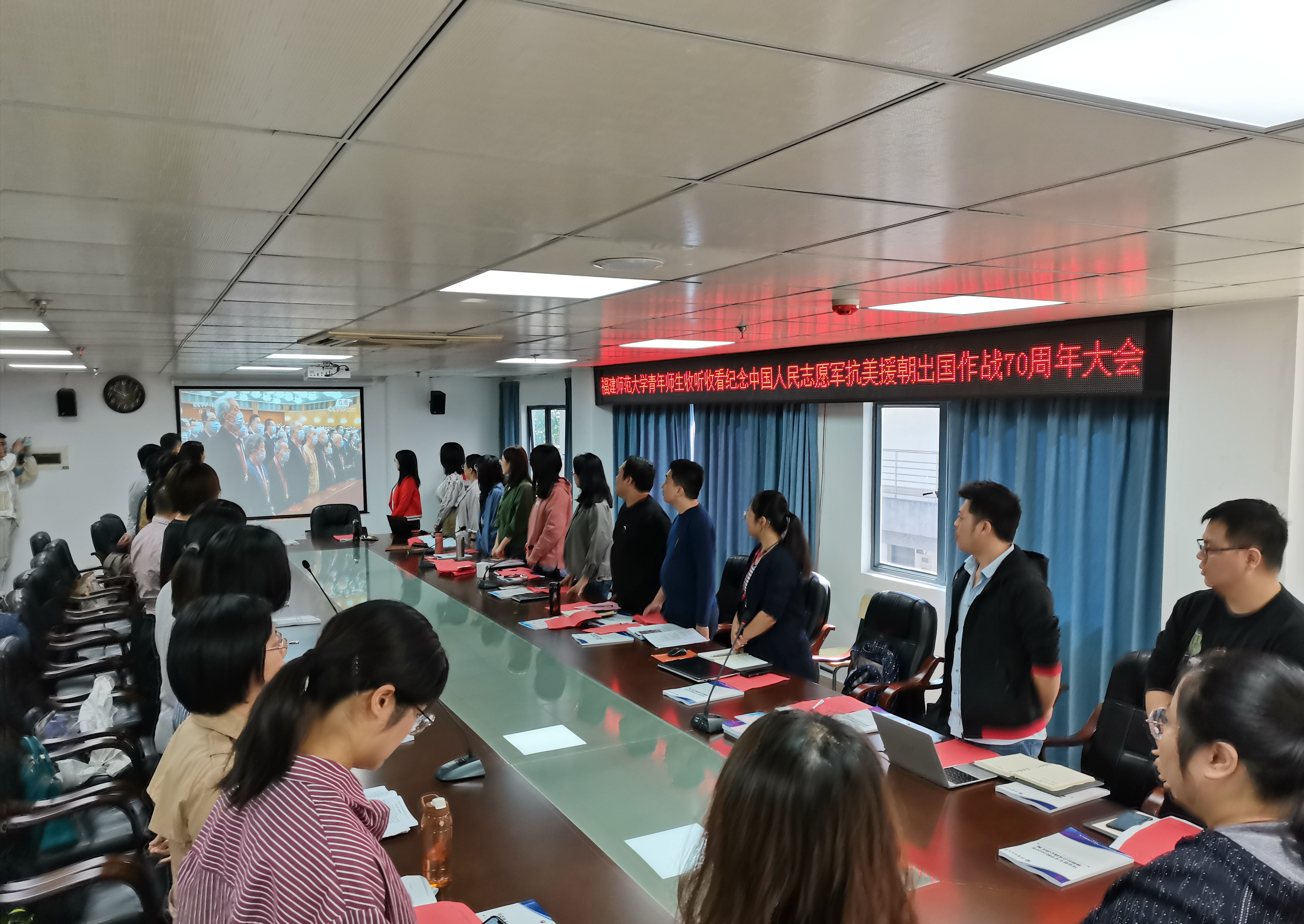 10月23日上午10时,纪念中国人民志愿军抗美援朝出国作战70周年大会在北京人民大会堂隆重举行。中共中央总书记、国家主席、中央军委主席习近平出席大会并发表重要讲话。校团委、校学生会组织青年师生收听收看大会现场直播,学习习近平总书记讲话精神,共同向英雄致敬。