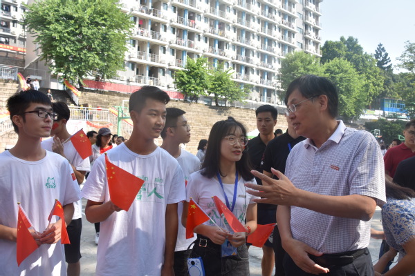 活动现场布置突出了祖国华诞、改革开放、爱校荣校等元素。李宝银一行深入活动当中,与同学们一同参与、共同游戏,高度评价了同学们设计的活动,并与青年学生进行了亲切交谈。