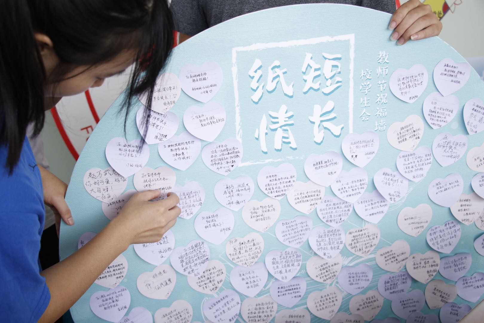 “桃李不言,下自成蹊”。同学们在校学生会提前设计好的祝福板前手写教师节祝福语,并合影留恋。字里行间透露着对老师的无限爱意和衷心的问候,吸引众多师生参与。