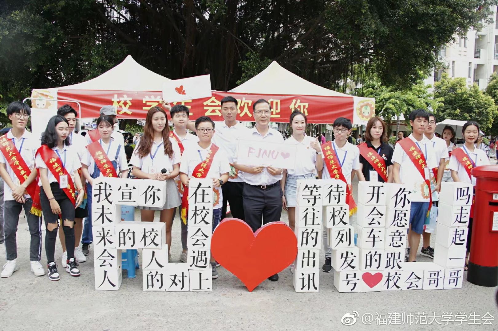 除签名墙外,手工立体字模型也成为了吸引新生驻足的一道亮丽的风景线。白板包裹的纸盒搭成FJNU四字,并在上面写满师大人对未来的期许和信心,献礼师大,献礼青春。我校领导也高度重视新生报到工作。为确保迎新工作的顺利进行,在校学生会主席团的带领下,我校校长王长平来到东门、东区田径场、共青团广场及各学院迎新点,。对校园整体迎新氛围营造、安保工作、大本营的布置等事项进行了仔细检查,慰问了工作在一线的师生,并对新生及家长表示了热烈的欢迎。随后,王校长与工作人员在立体字前合影留念,共祝师大美好明天。