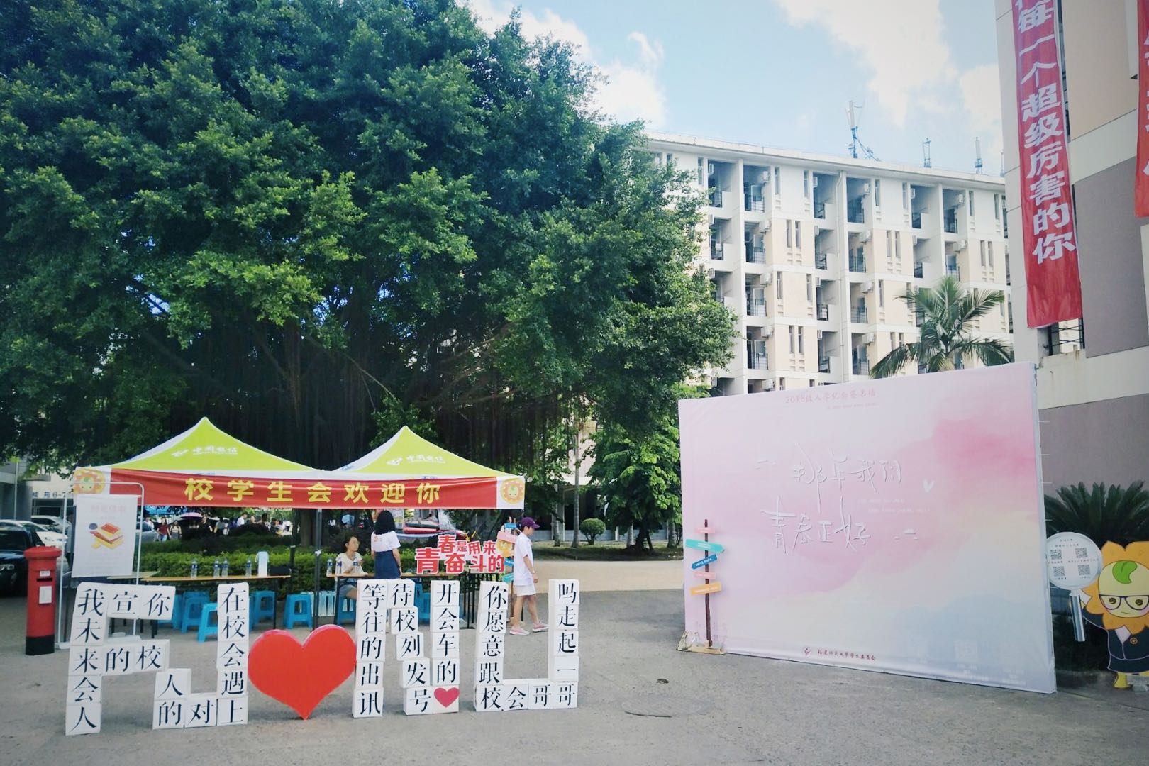 活动前期,校学生会设计并制作了主题为 “那年,我们青春正好” 的2018级新生签名纪念墙。这也成为了迎新当天现场的一大亮点。新生路过时不禁在签名墙前停下脚步,与家长一起拍照留念,四年的大学生活便从此启航。