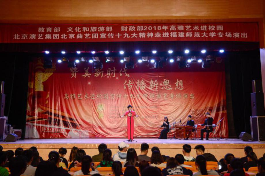 “赞美新时代 传播新思想”,11月21日,由教育部、文化和旅游部、财政部主办,省教育厅协办,我校承办的高雅艺术进校园宣传党的十九大精神曲艺专场演出在青春剧场隆重上演,共吸引了一千余名学生到场观看。