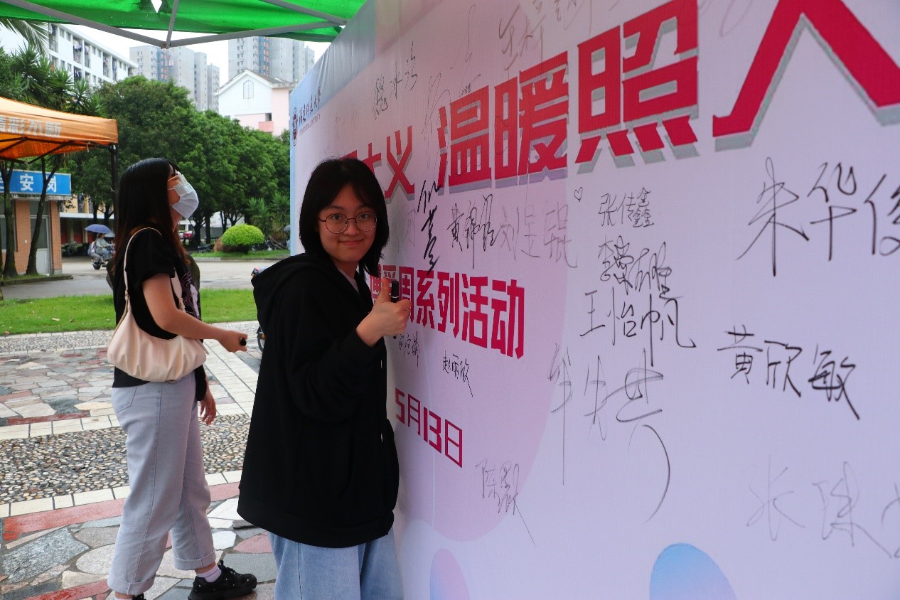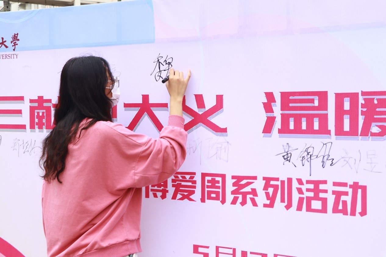 该活动面向全体同学,通过线上征集同学们拍摄的三献祝福视频,表达对三献者的祝福。此外,我校红十字会在共青团广场增设了线下祝福活动,同学们与献血证书合影并签名写下自己对三献者的祝福。