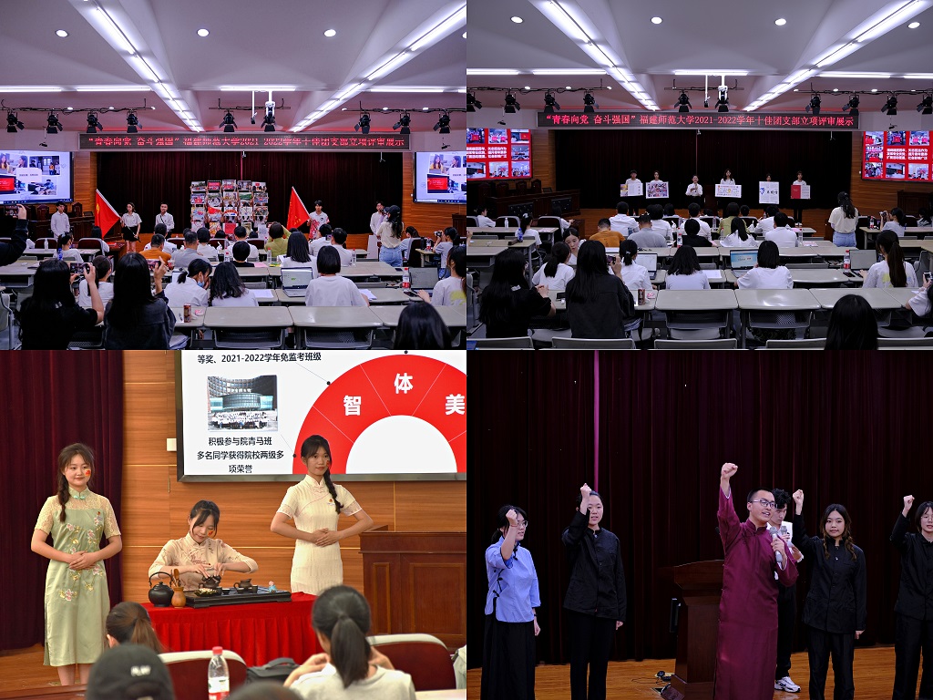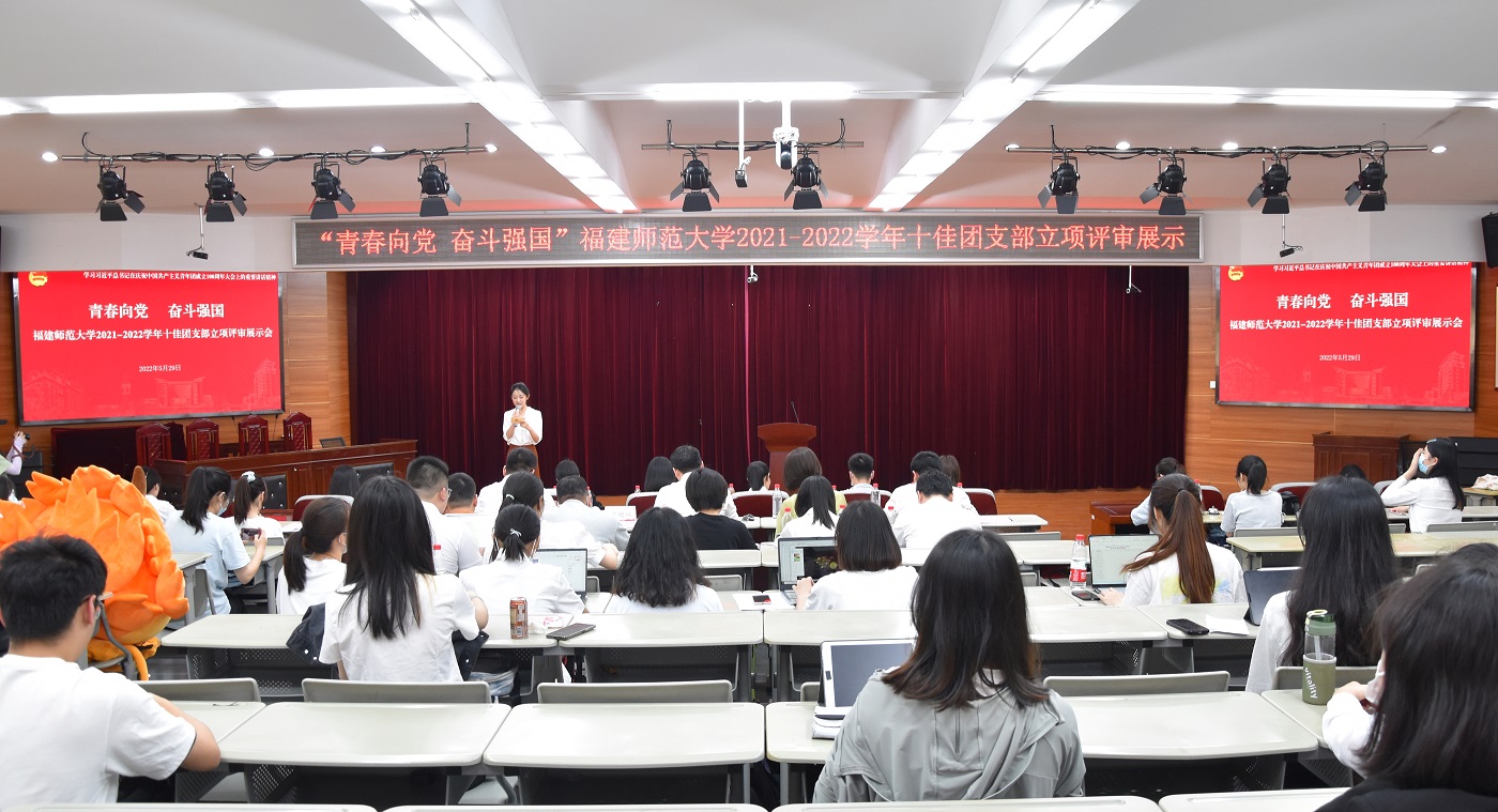 为学习宣传贯彻习近平总书记在庆祝中国共产主义青年团成立100周年大会上重要讲话精神,5月29日下午,由校团委主办的福建师范大学2021-2022学年“青春向党奋斗强国”团支部立项十佳评比活动评选在旗山校区模拟法庭举行。
