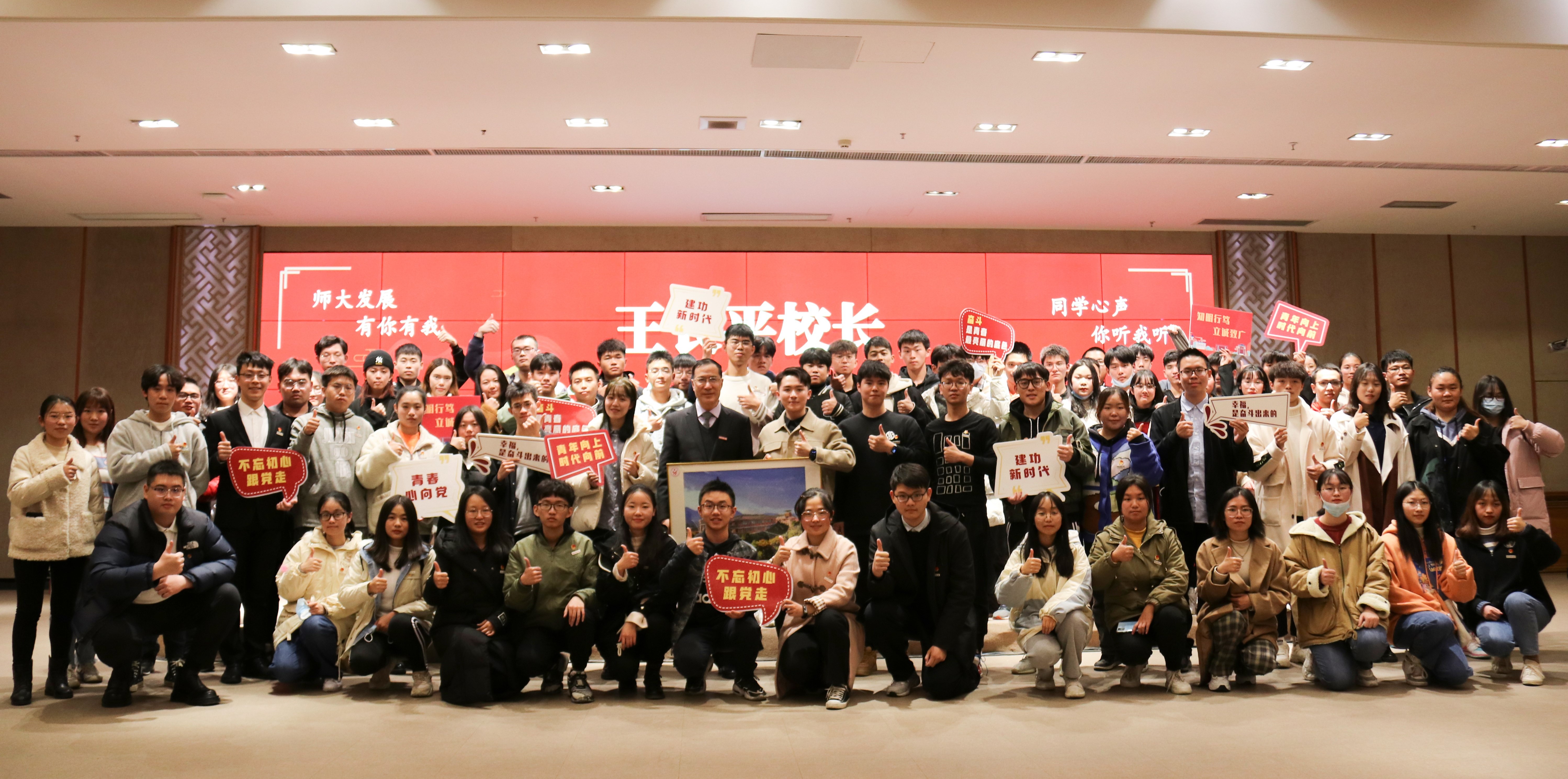 活动结束后,王长平校长亲切地与同学合影留念。校学生会的同学还向王校长赠送了一幅用五万个小水钻绘制拼接而成的师大钟楼的钻石画。在现场未能提问的同学填写了提案单,校学生会将继续做好提案的整理、分类,并将提案反馈给各有关职能部门。