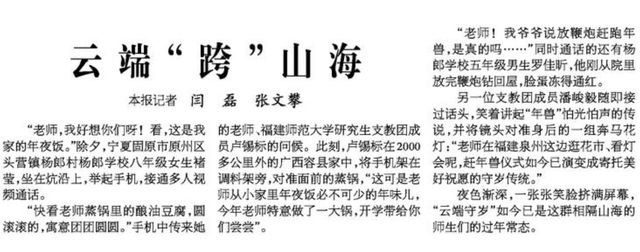 光明日报(记者:闫磊 张文攀)“老师,我好想你们呀!看,这是我家的年夜饭。”除夕,宁夏固原市原州区头营镇杨郎村杨郎学校八年级女生褚莹,坐在炕沿上,举起手机,接通多人视频通话。
