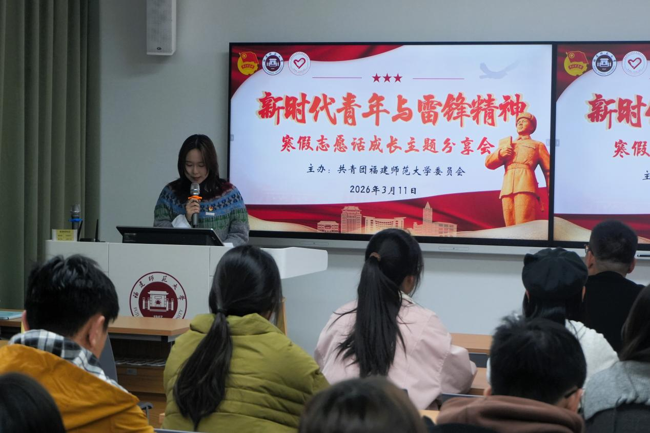 为深入学习贯彻习近平总书记关于弘扬雷锋精神的重要指示精神,集中展示我校学子在寒假期间投身志愿服务的丰硕成果,3月11日,由共青团福建师范大学委员会主办、校青年志愿者工作中心承办的寒假志愿话成长主题分享会在旗山校区顺利举行,本次活动主题为“新时代青年与雷锋精神”。校院两级青年志愿服务组织相关负责人,寒假志愿活动优秀学生代表参加活动。